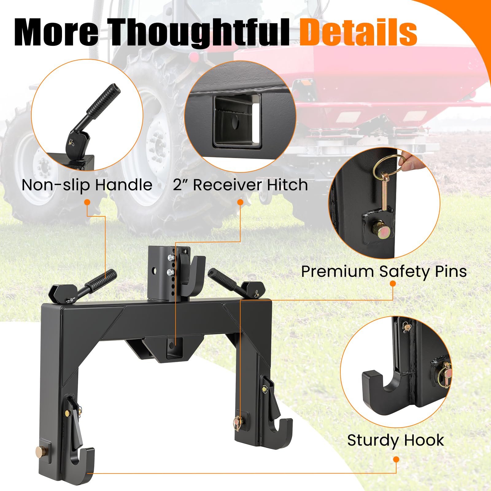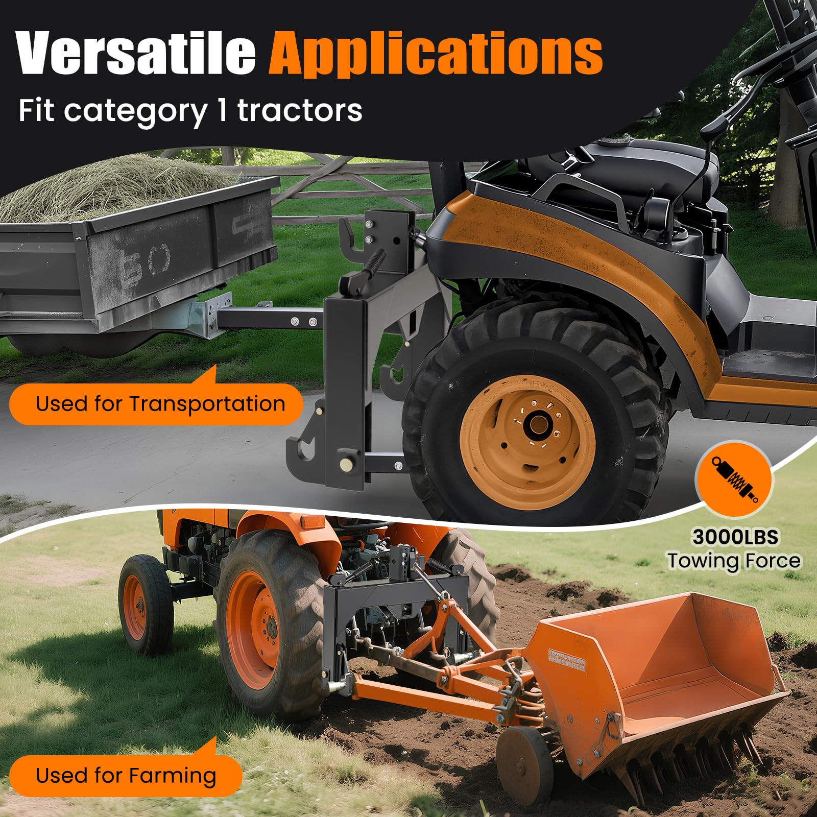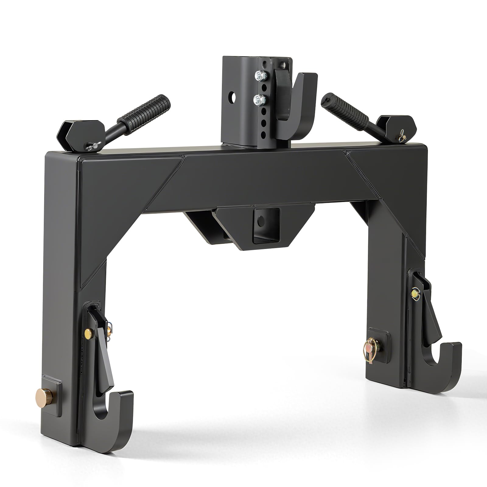 Looking for a reliable tractor hitch receiver that can handle heavy-duty tasks with ease? This 3-point hitch attachment offers a 3000 lbs towing capacity, making it perfect for various towing jobs. With a 2" receiver hitch, it fits most vehicles. Additionally, the 5-level adjustable top hook allows effortless adaptation to your tractor without drilling or welding, ensuring compatibility with a wide range of farming and towing equipment. The lever-operated mechanism ensures reliable performance, while the non-slip handle and dual pin hooks with limit functions enhance stability during heavy tasks. Hence, this category 1 quick hitch accommodates a wide range of attachments like plows and seeders, making it ideal for farming, transportation, and construction tasks.