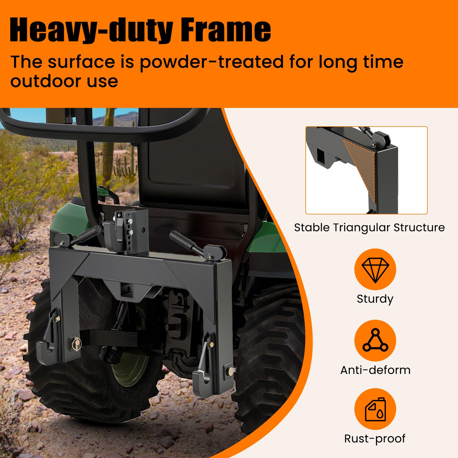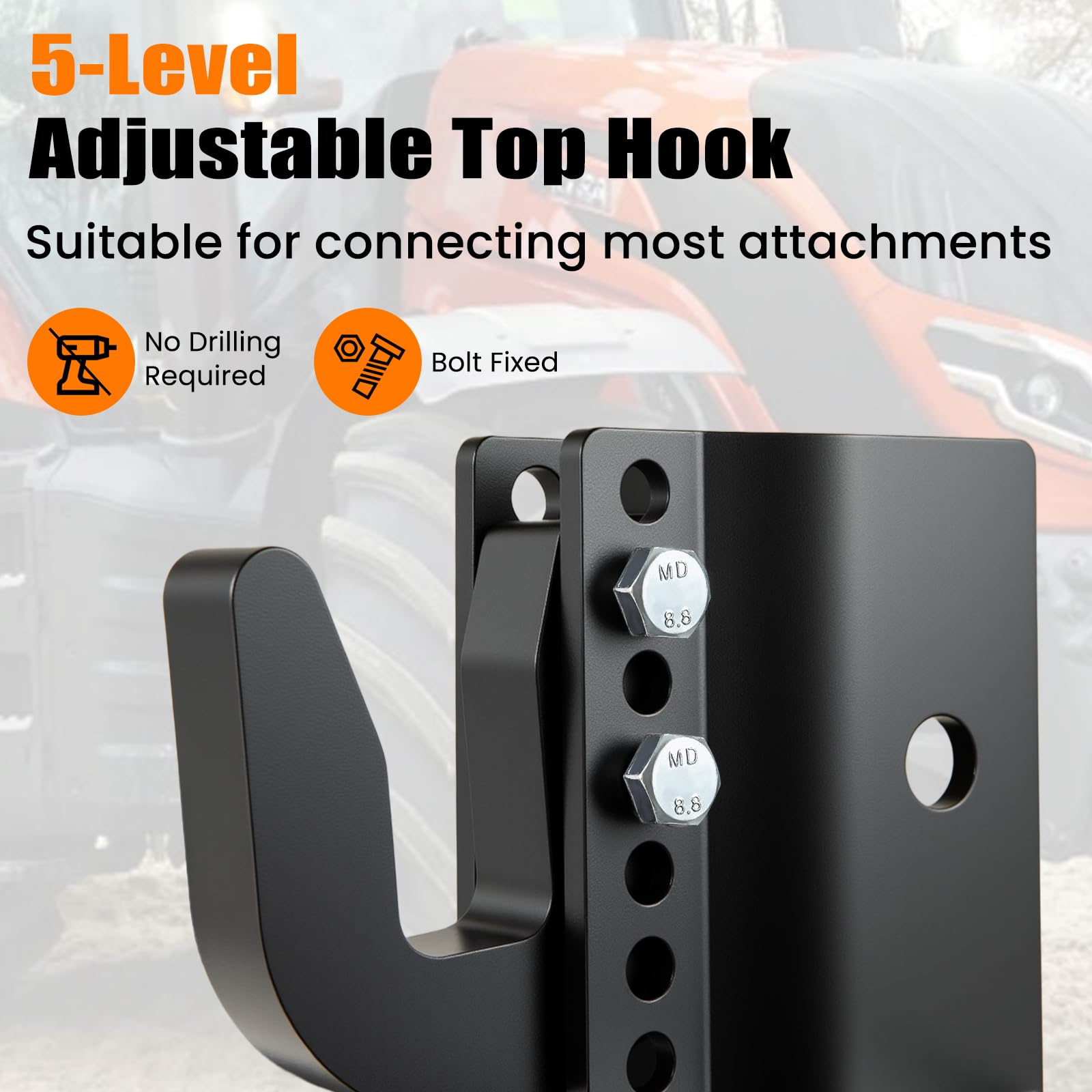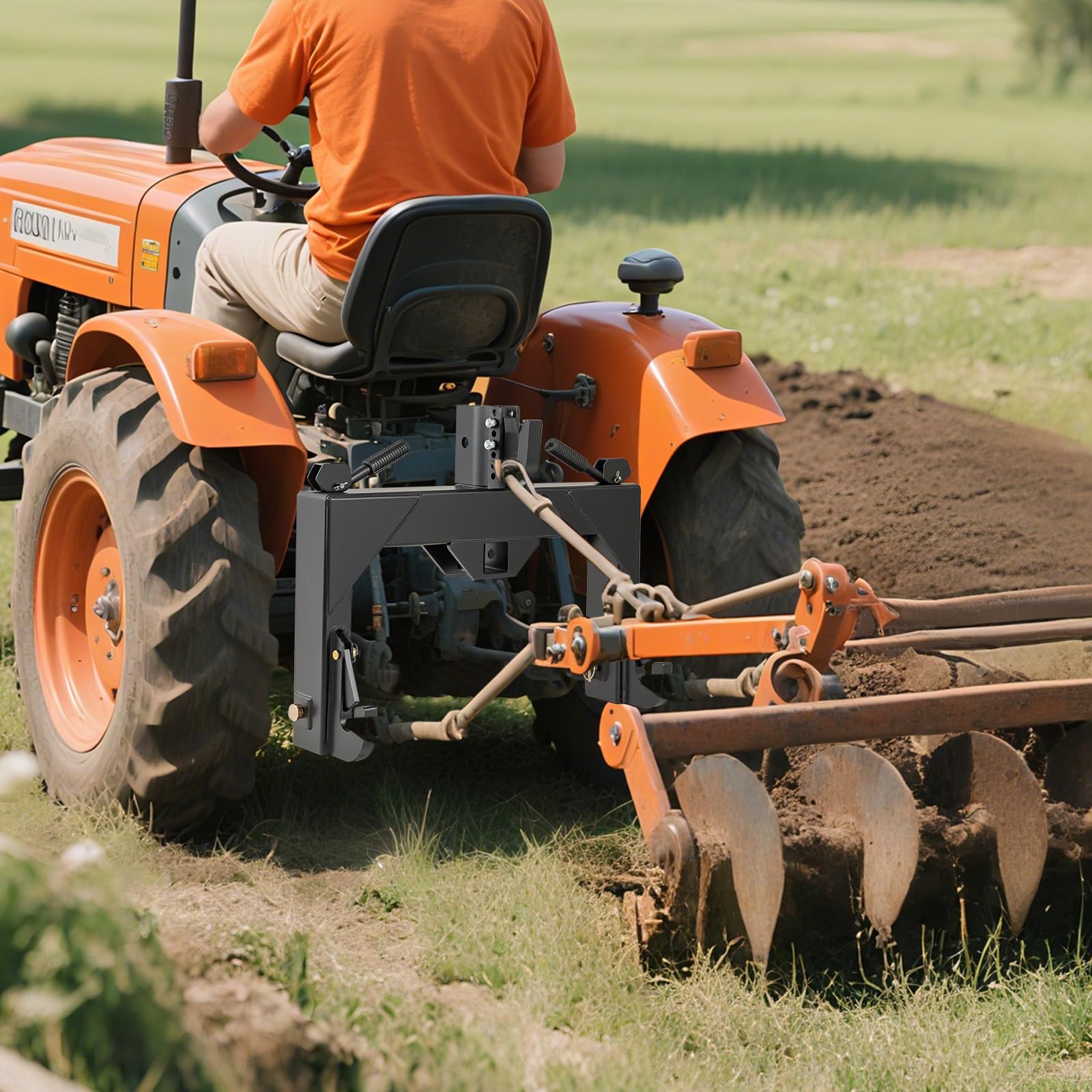 Looking for a reliable tractor hitch receiver that can handle heavy-duty tasks with ease? This 3-point hitch attachment offers a 3000 lbs towing capacity, making it perfect for various towing jobs. With a 2" receiver hitch, it fits most vehicles. Additionally, the 5-level adjustable top hook allows effortless adaptation to your tractor without drilling or welding, ensuring compatibility with a wide range of farming and towing equipment. The lever-operated mechanism ensures reliable performance, while the non-slip handle and dual pin hooks with limit functions enhance stability during heavy tasks. Hence, this category 1 quick hitch accommodates a wide range of attachments like plows and seeders, making it ideal for farming, transportation, and construction tasks.