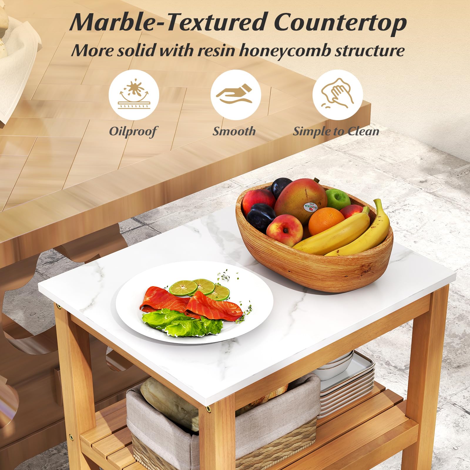 Constructed from high-strength acacia wood, the outdoor kitchen shelf features a reinforced connection for high stability. And the countertop is more solid with resin honeycomb structure, which is marble-textured and easy to clean. With sufficient storage space, the outdoor cabinet is perfect for organizing kitchen essentials, drinks, or gardening supplies. With thoughtful details, versatile unit brings lasting functionality and charm to your backyard or deck.