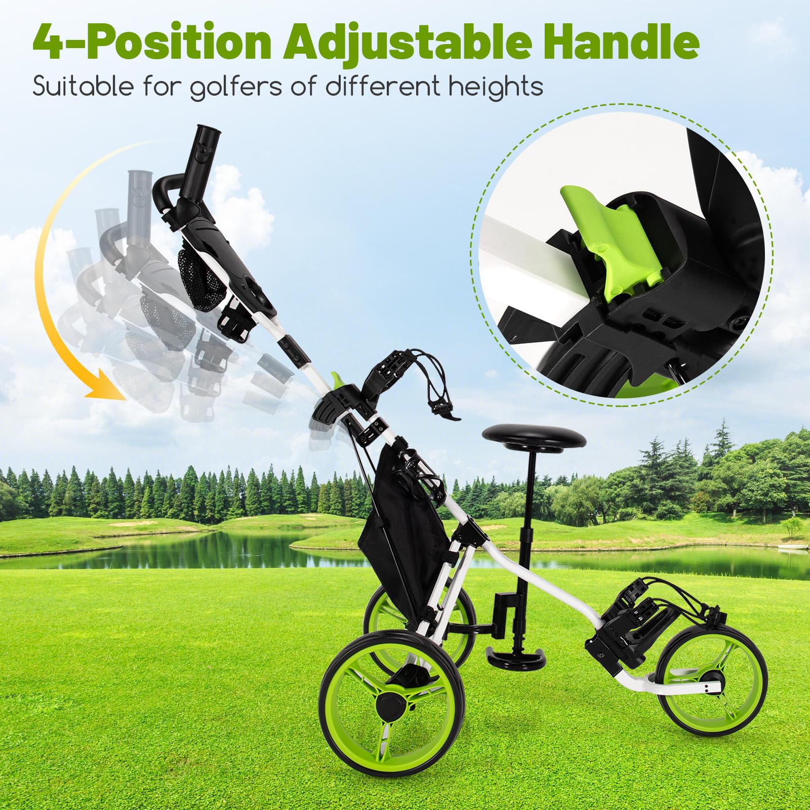 The special slots on the bag bracket ensure a perfect fit for most golf bags, eliminating any unwanted movement during transport. Plus, you can enjoy personalized comfort with adjustable seat and handle heights, catering to users of varying heights. And for meeting personal needs, the seat is detachable. Stay organized on the course with the extra storage features including an umbrella holder, scoreboard holder, multiple golf ball holders, tee holders and cup holder—all within arm's reach. For added convenience, the space-saving foldable design allows for easy storage and transportation, making it the ideal choice for golfers on the go.