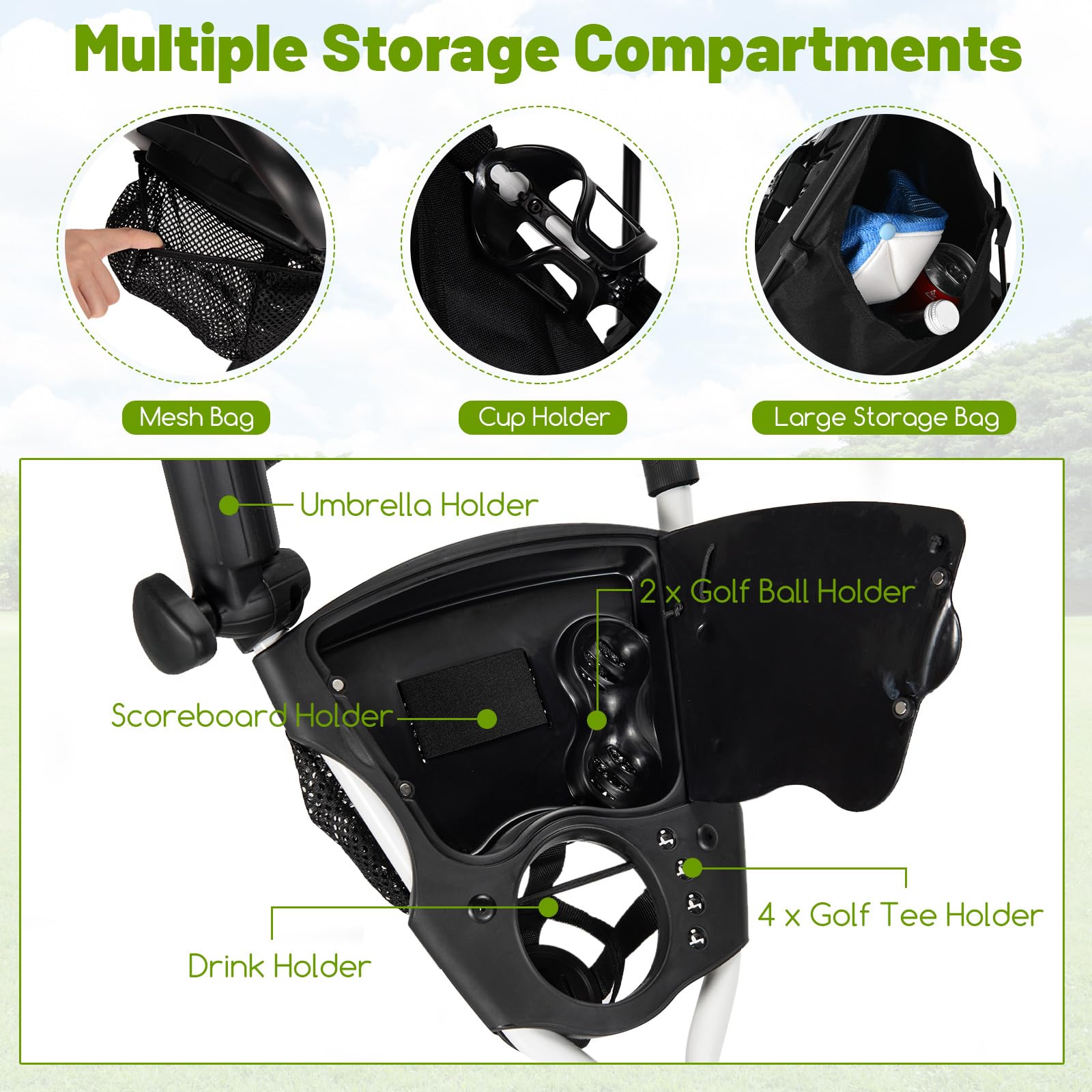 - Extra Storage Space: This golf pull cart is designed with an umbrella holder and multiple storage compartments to keep all essentials within reach on the golf course, including a scoreboard holder, 2 golf ball holders, a drink holder, 4 golf tee holders, a mesh bag, a cup holder and a large storage bag.
