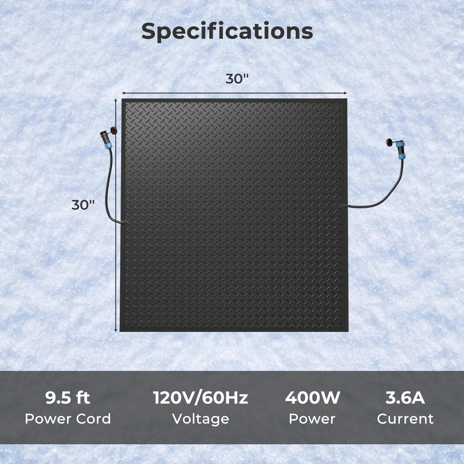 This snow melting mat features efficient heat distribution, melting snow at a rate of 3 in/h and ice at 1 in/h, while maintaining a safe surface temperature of 131℉. Designed with a dual-port system, this heated pad allows for the connection of up to 4 mats without exceeding a total power of 1600W, covering larger areas effortlessly. Safety is a priority, highlighted by its anti-slip rubber surface and an IP66 waterproof rating that ensures reliable performance in snowy conditions. The flexible roll-up design allows for compact storage, making it easy to put away when not in use. Additionally, it features a GFCI plug with a 9.5 ft power cord, equipped with an LED indicator, a red reset button, and a yellow test button, providing maximum safety and ease of use throughout the cold months.
