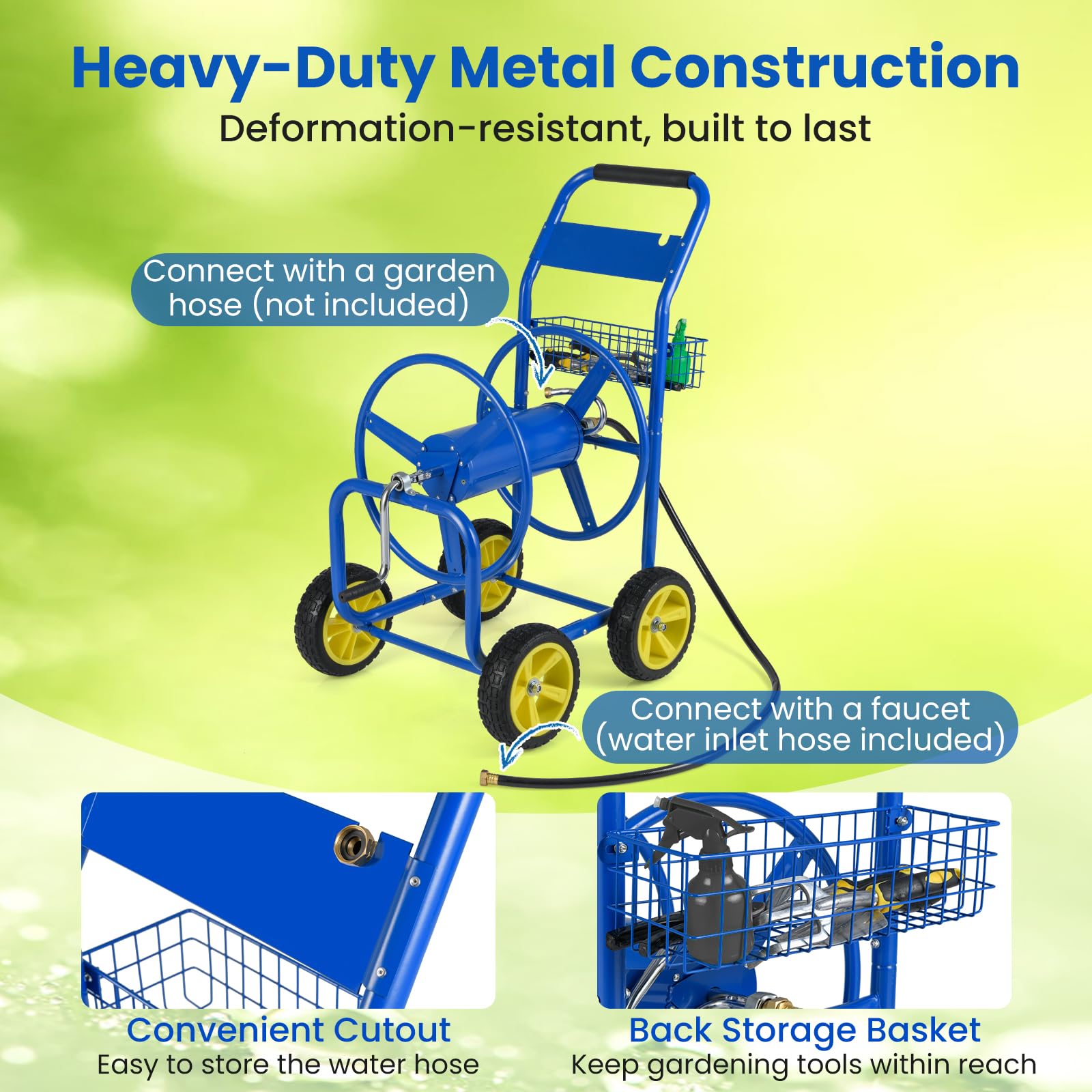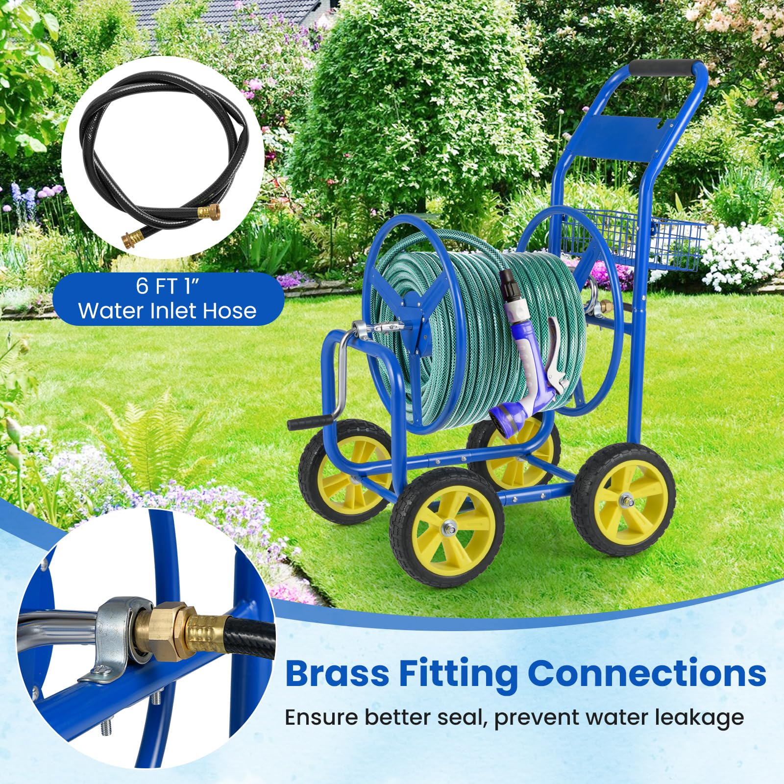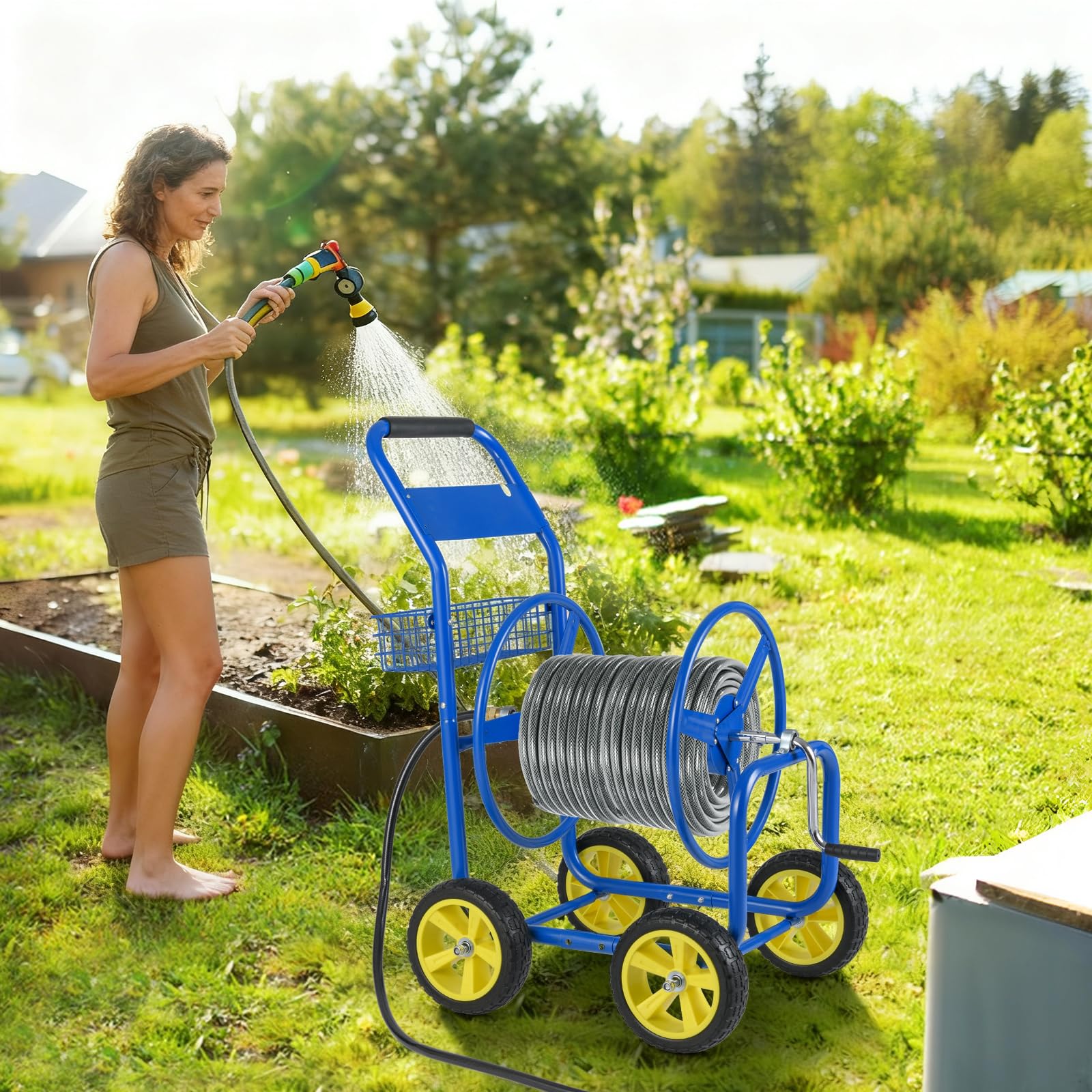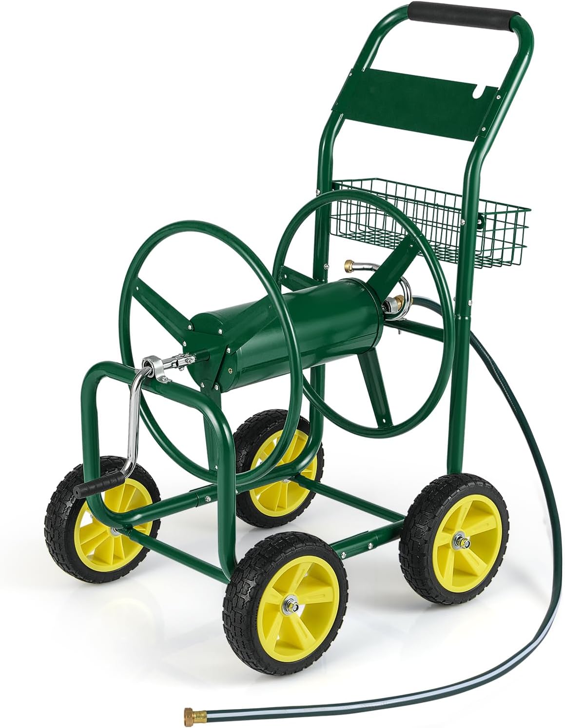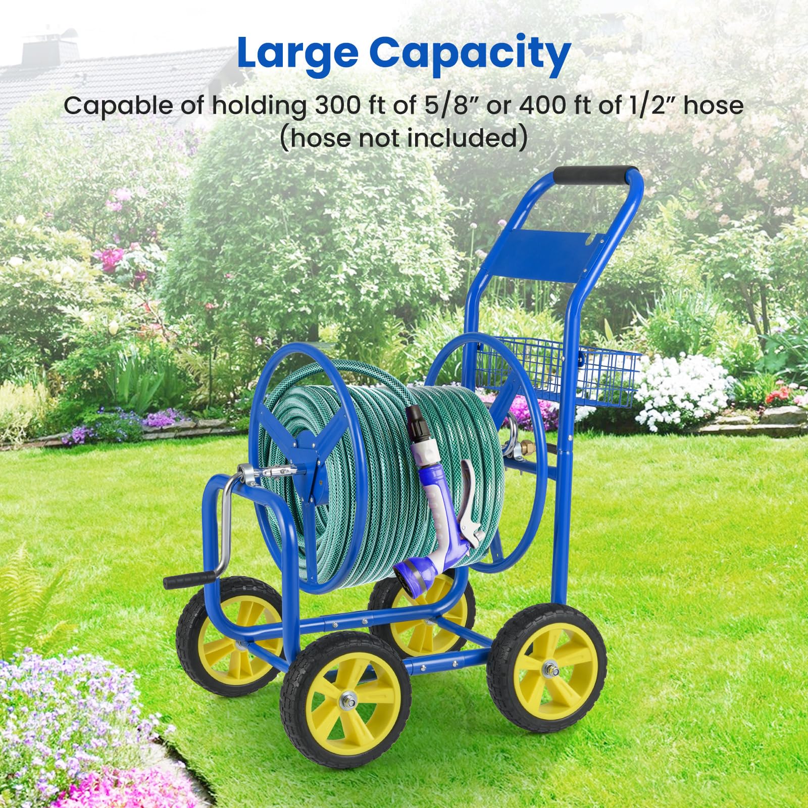 With the ability to hold up to 300 ft of 5/8" hose or 400 ft of 1/2"/90 m of 20 mm or 120 m of 15 mm hose, this garden hose reel cart is a must-have for extensive gardens. It features a sturdy 6 ft/186 cm 1"/25 mm water inlet hose, enhancing its reach and practicality. Crafted with durability in mind, it employs brass fittings to prevent leaks and a heavy-duty metal frame that stands up to daily wear and tear. Mobility is effortless, thanks to four solid 10"/25 cm tires and a foam-padded handle that eases transportation across varied terrains. The cart is equipped with a labor-saving crank for quick hose winding and unwinding, and a back storage basket for carrying extra tools or supplies. Whether you're watering lawns, washing cars, or bathing pets, this garden hose reel cart simplifies all your watering needs and stands as an indispensable tool for both personal and commercial landscaping projects.