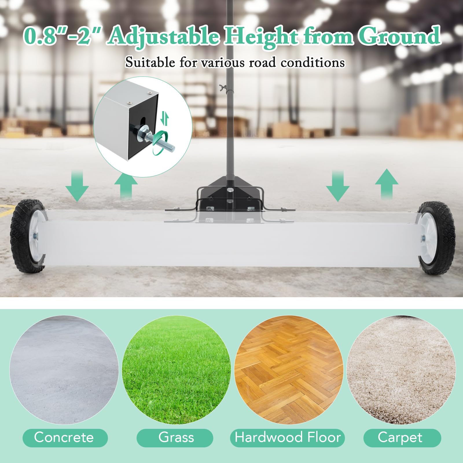 0.8"-2" adjustable height from ground makes it suitable for sweeping different surfaces