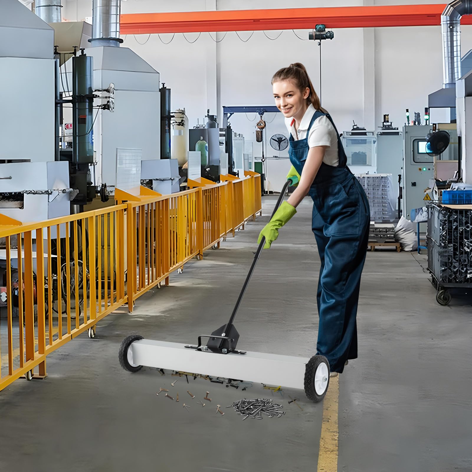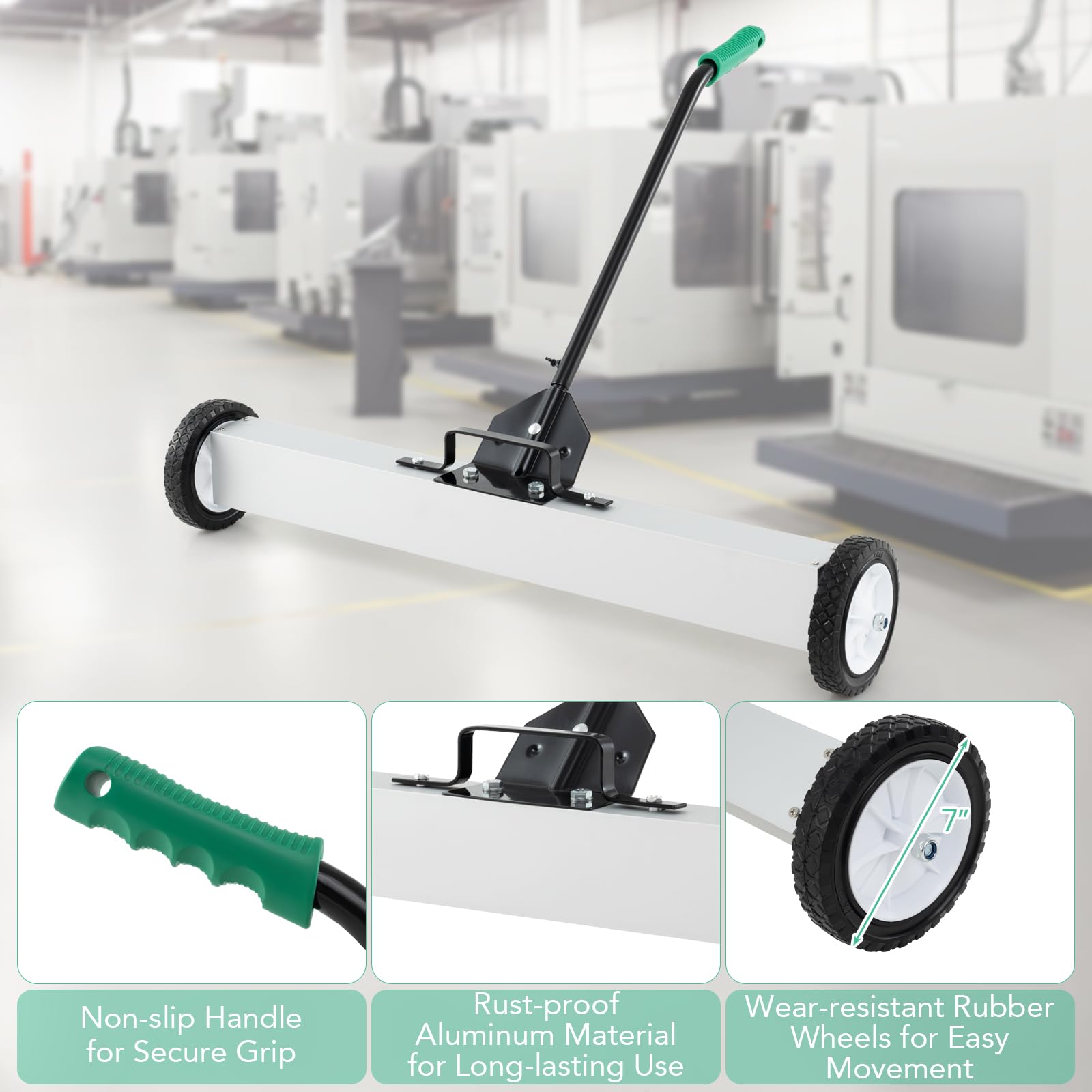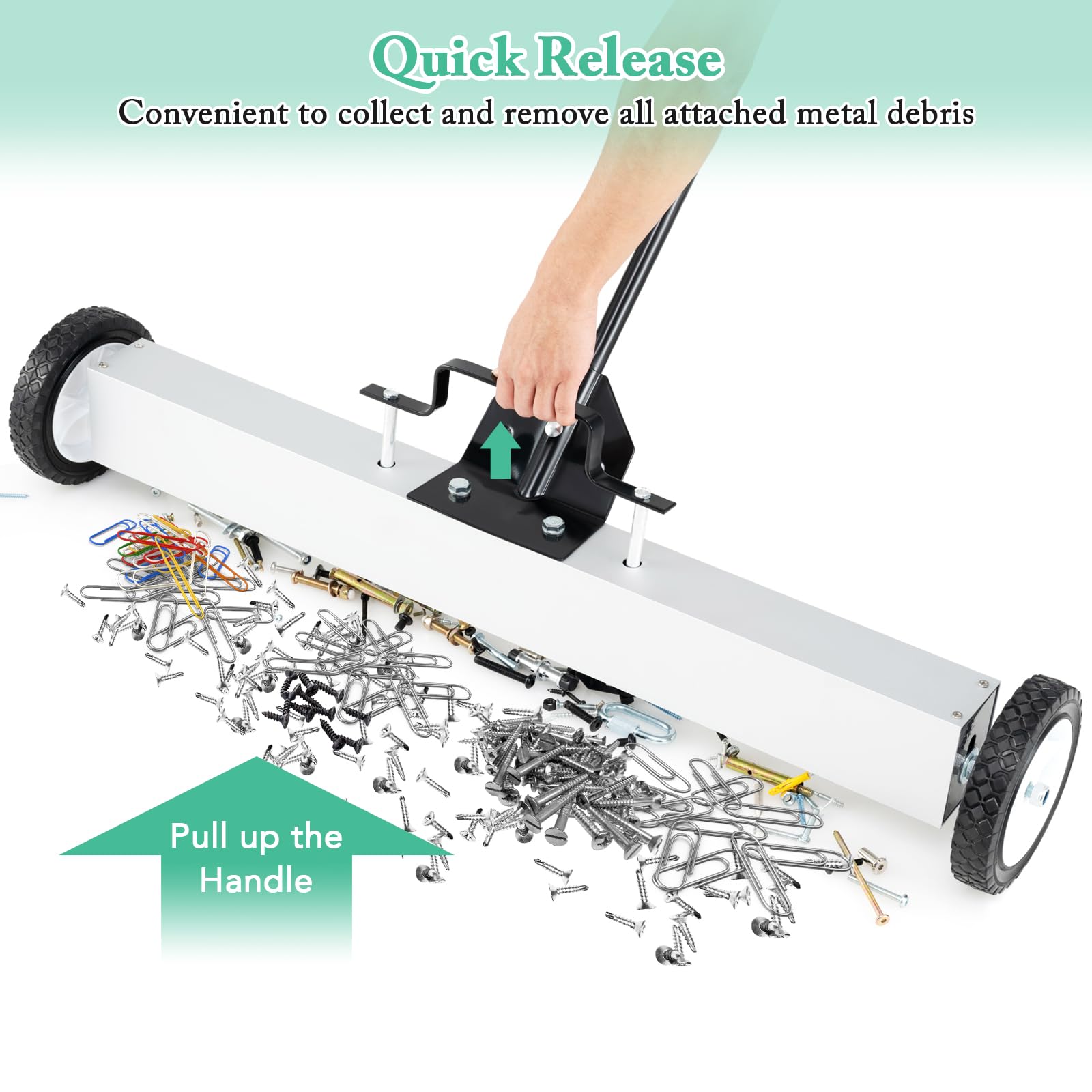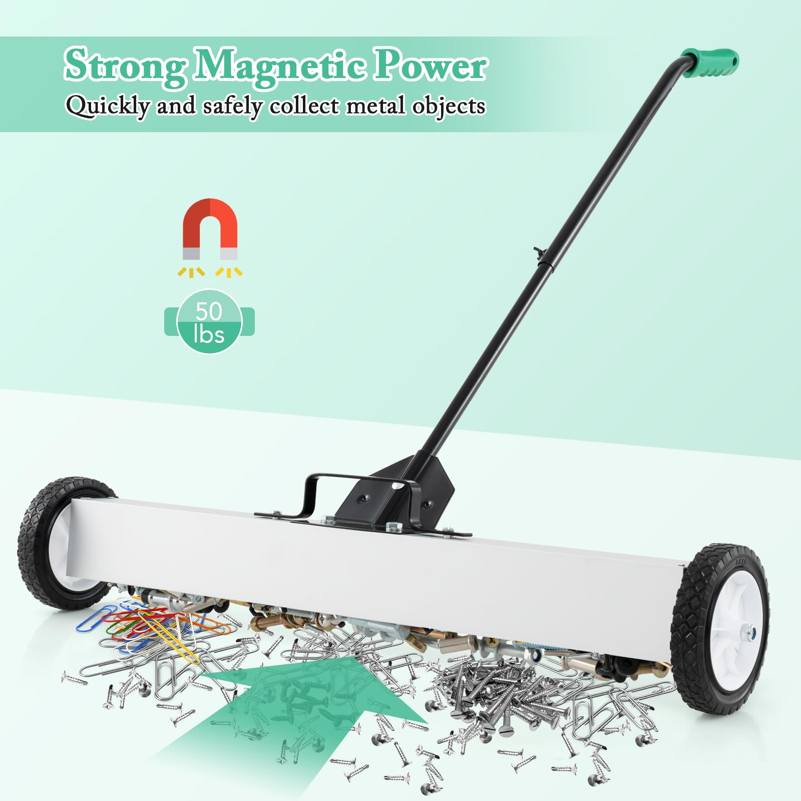 Conquer clutter with this magnetic marvel! Boasting a 36-inch sweep of magnetic mastery, it captures up to 50 lbs of metal mess in a snap - Perfect for shops, job sites, or your next garage project! Get back to work faster with the quick-release debris drop - just pull up the handle and you're done! Customize comfort with the telescopic handle. No need to bend over! Tweak its terrain-taming clearance and watch it whisk away waste on any surface. Your reliable, rough-and-tumble cleanup companion doesn't flinch; thanks to tough wheels, roll through the toughest tasks with unstoppable ease. Click to command this clean-up powerhouse now!