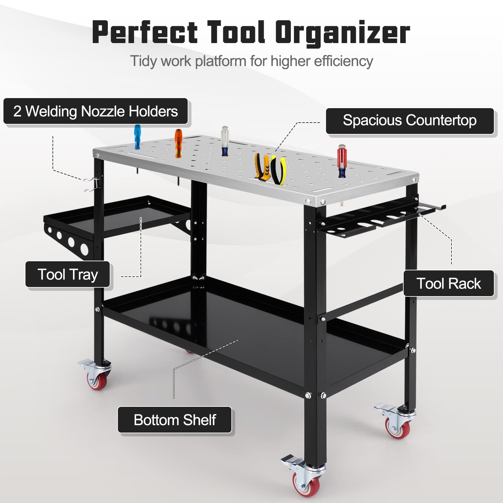 - Perfect Tool Organizer: With a spacious countertop, bottom shelf, tool tray and tool rack, 2 welding nozzle holders, 8 tooling slots, this welding table will keep all your essential welding tools neatly organized and within reach, providing a tidy work platform for higher efficiency.