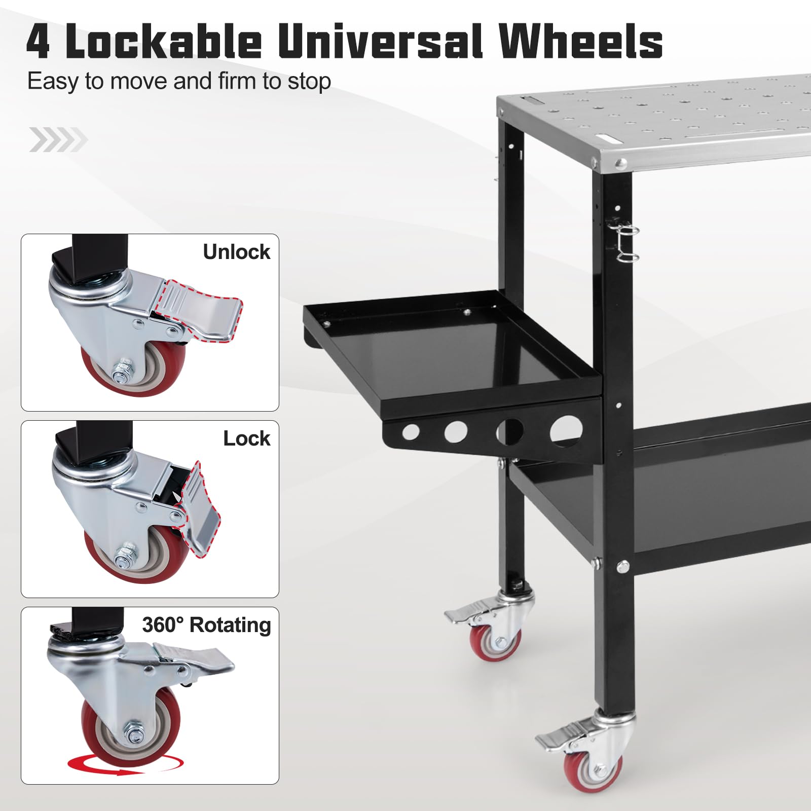 - 4 Lockable Universal Wheels: This welding workbench features 4 wheels with 360° rotating and locking design, providing smooth mobility across the workshop. Lock the wheels to secure the table in place for stable and accurate welding operations.