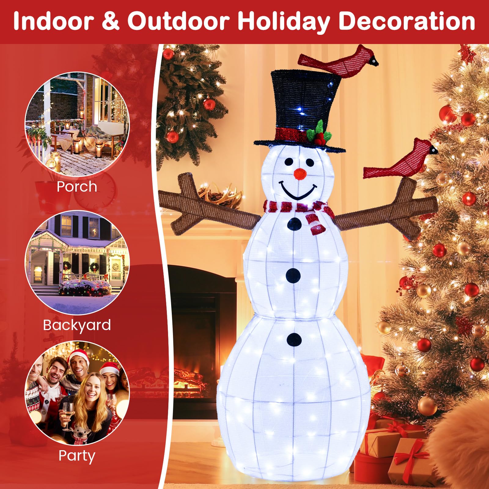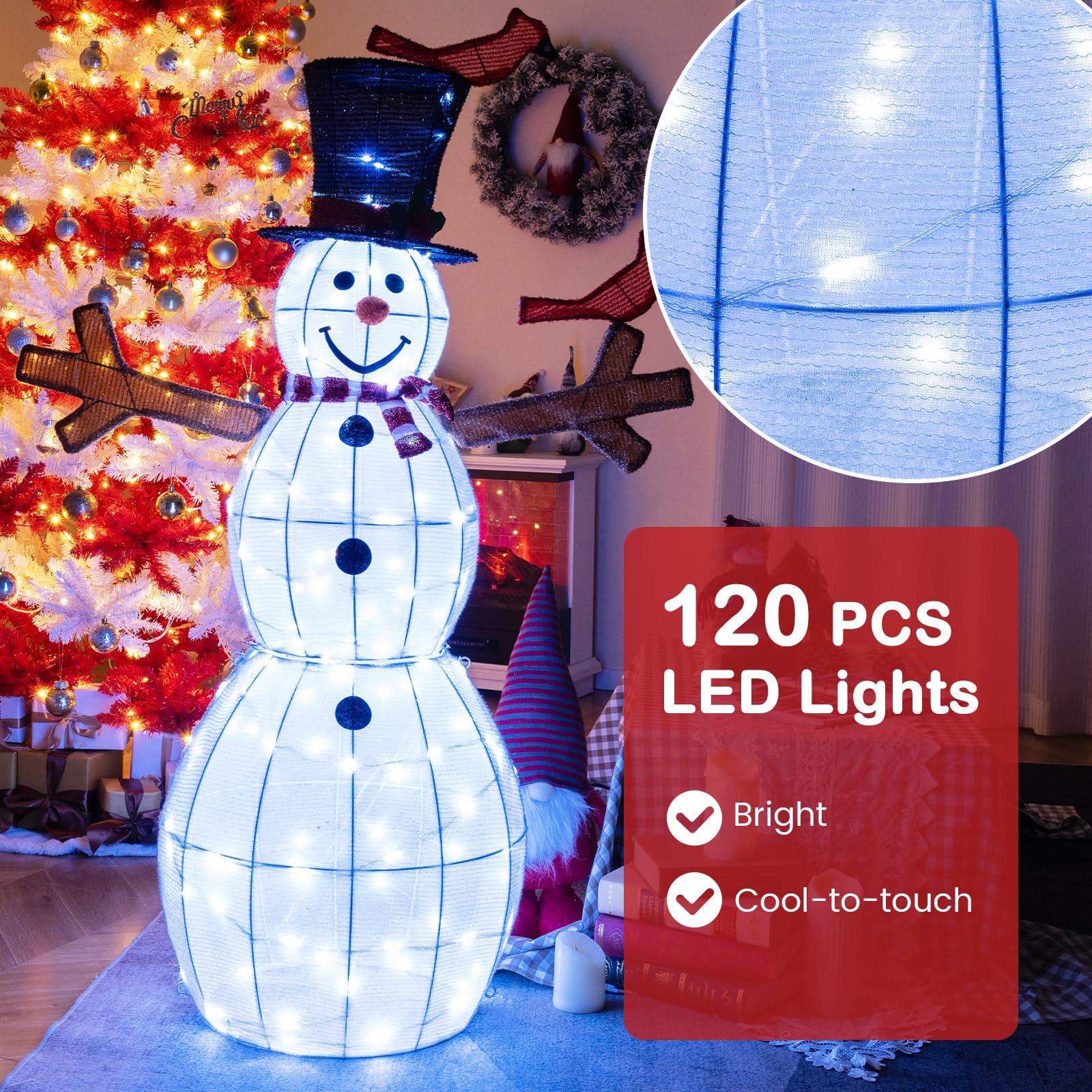 Featuring 120 LED lights, this festive snowman shines brightly, creating a magical winter wonderland in your yard or home. Designed with charming details like a black cap, striped scarf, and 2 red birds, it adds a delightful touch of holiday cheer to any space. Made from high-quality, weather-resistant fabric, the lighted snowman can withstand wind, snow, and rain, while the sturdy metal frame ensures stability. Setup is quick and easy with included zip ties, wind ropes, and ground stakes.Whether indoors or outdoors, this collapsible snowman is the perfect decoration for porches, gardens, and holiday parties, spreading joy all season long!