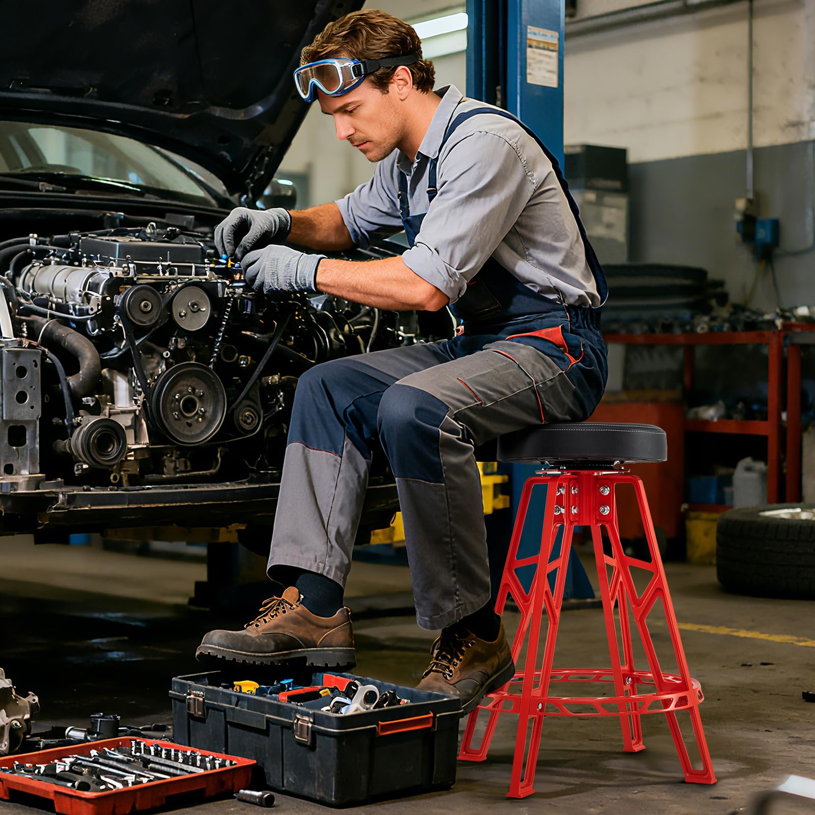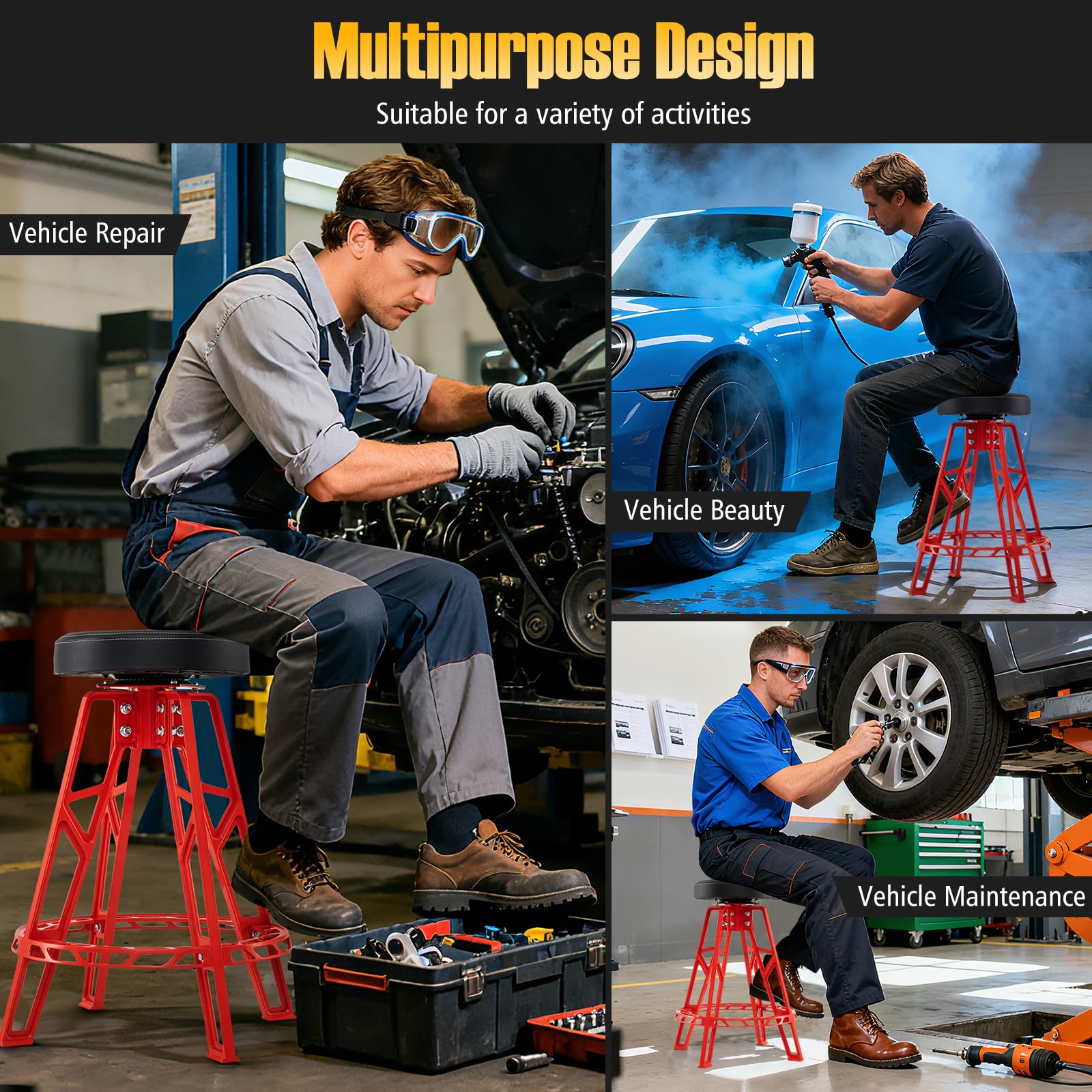 This mechanic garage chair features a lightweight yet sturdy aluminum frame, holding up to 400 lbs. With multilayer construction, the seat cushion provides exceptional comfort and durability, while the waterproof surface facilitates daily maintenance. The 360° swivel seat enables easy access to tools without leaving your seat. Additionally, the built-in footrest on this metal stool chair promotes relaxation during extended work sessions. Ideal for vehicle repair, maintenance, and beauty tasks, this tall shop stool serves well in your home workshop, garage or repair shop.