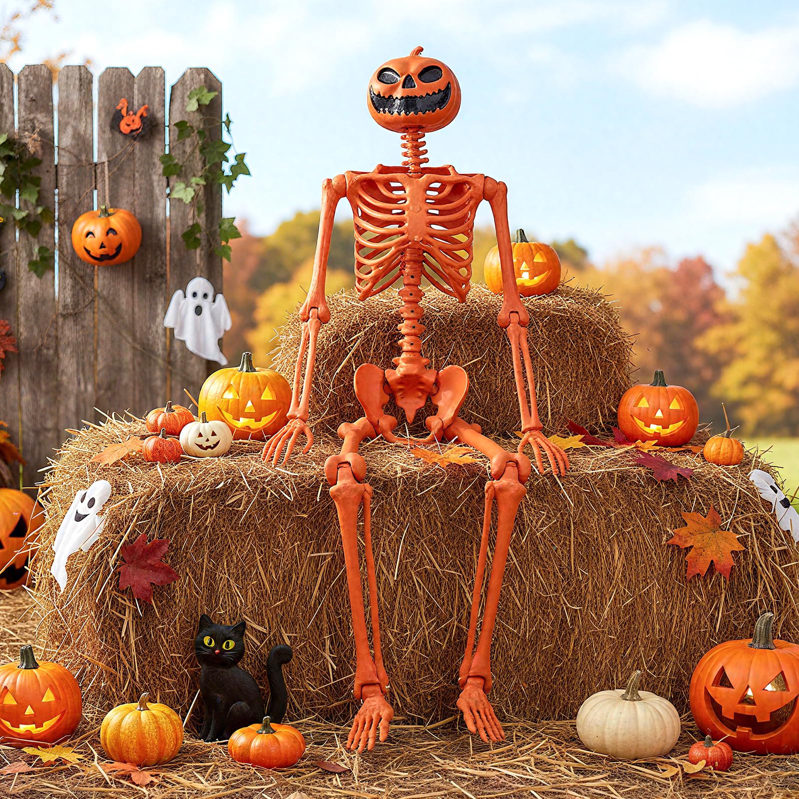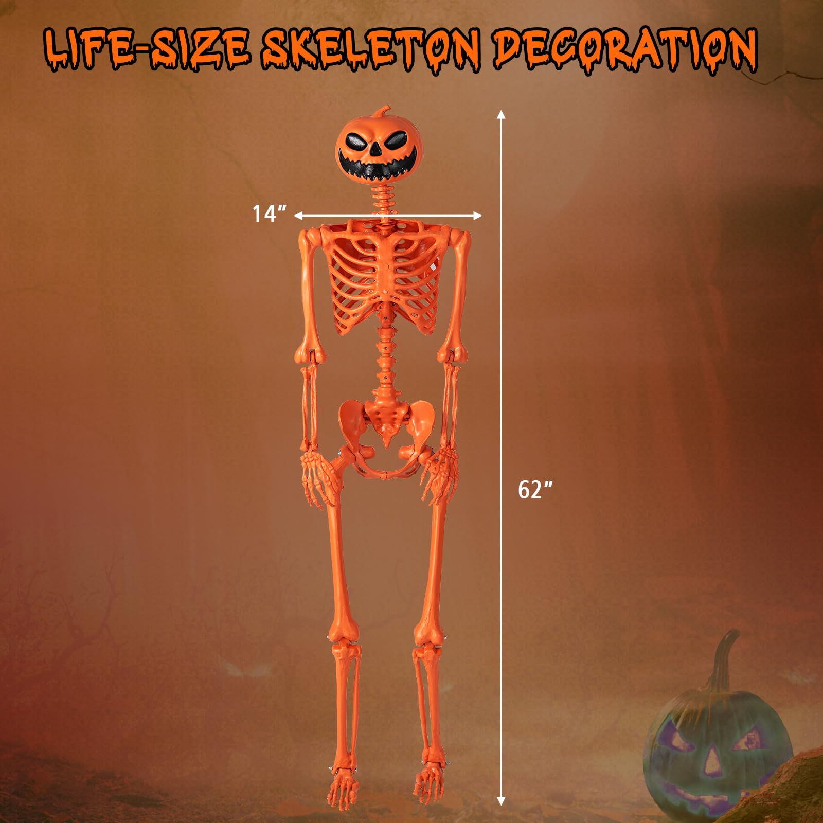 Standing 62 inches tall, this life-size skeleton decoration brings a spooky yet festive vibe with its pumpkin head and 7 posable joints. Arrange it in cheerful hand-waves, dynamic dances, or even a classic “pondering man” pose if you like. No assembly or tools required! For flexible display, it comes with a hanging rope for trees or doorways, and can also sit freely on any flat surface. Plus, crafted from weather-resistant materials, it’s built to withstand outdoor elements for years of use. Bring this skeleton decoration home, and infuse your Halloween scene with your own personality and ideas!