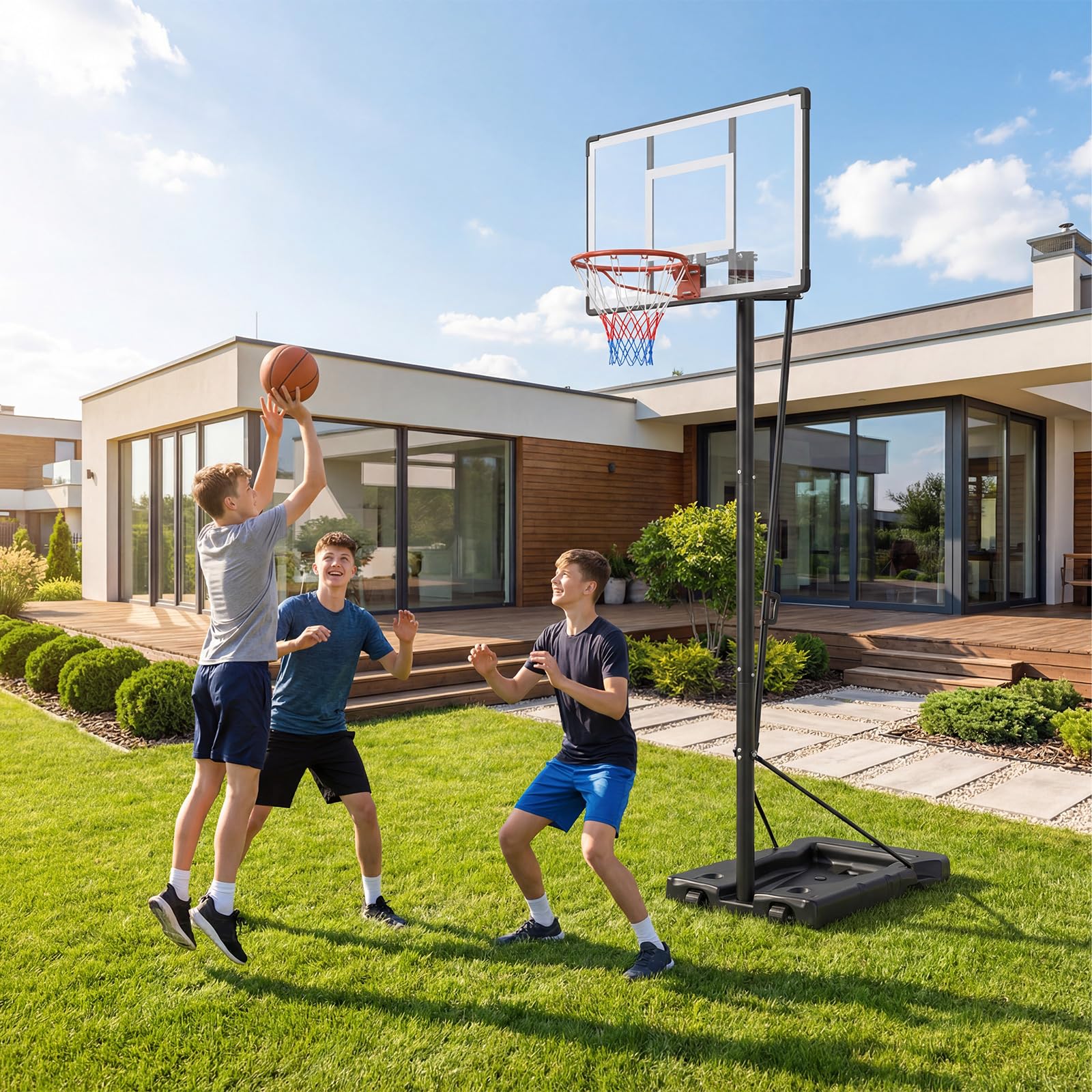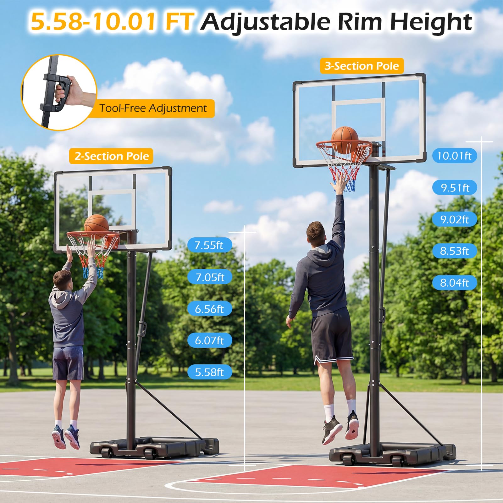 This versatile basketball system features a 5.58-10.01 ft adjustable rim height, allowing you to customize the hoop effortlessly to suit players of any age or skill level. Its wide, heavy-duty base (27.5"L x 43.5"W) offers exceptional stability and can be further fortified by filling it with sand or water. The shatterproof backboard crafted from premium PC resists impact and sun damage, while shock-absorbing springs minimize noise. Built with a robust metal frame and a reinforced triangular base, this portable basketball hoop ensures lasting strength during intense games. Equipped with 2 convenient wheels, it's easy to move the setup wherever you desire, whether by the pool, in your driveway, backyard, or even indoors, offering flexible, dependable play for the whole family.