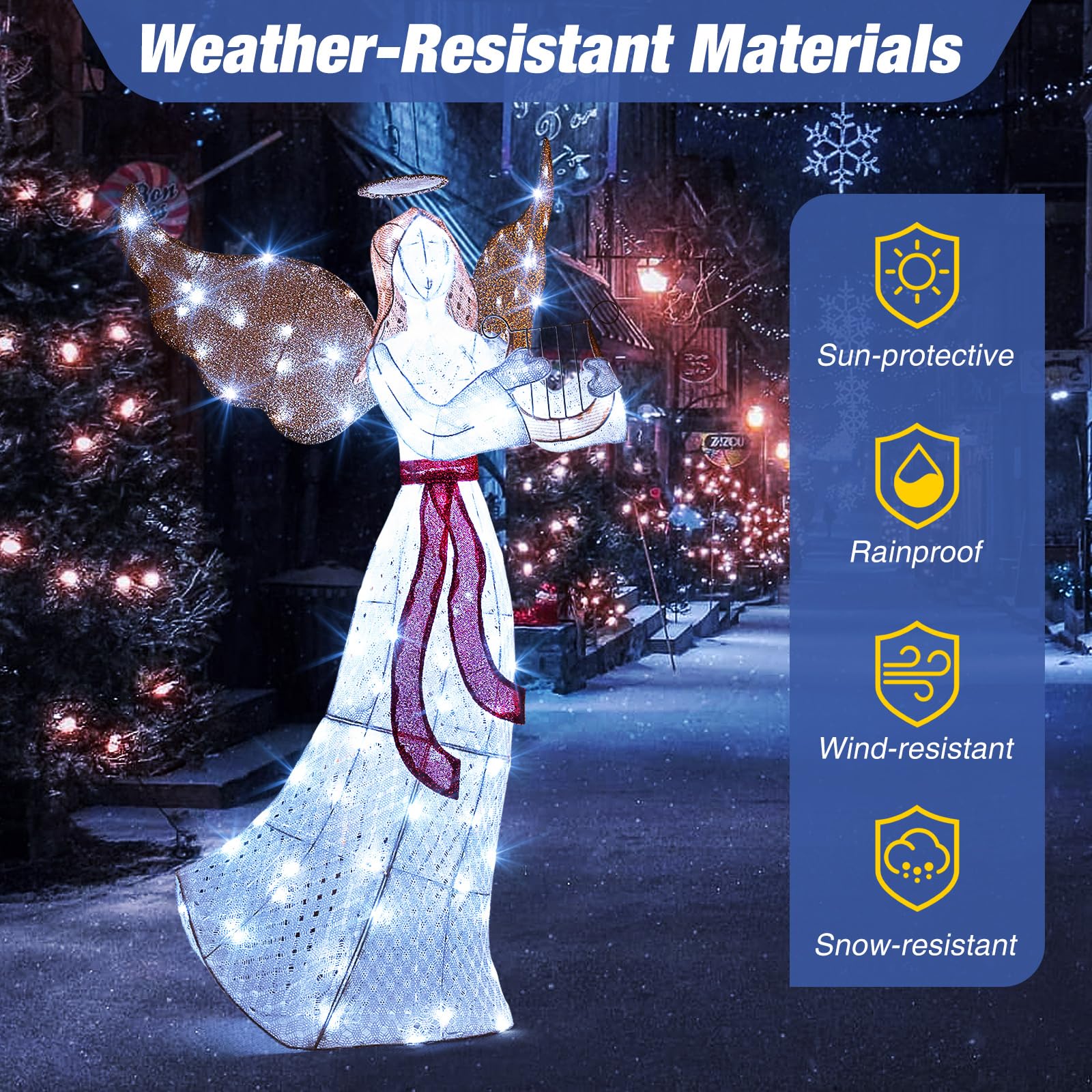 - Weather Resistant Materials: This pre-lit Christmas angel is made from high-quality mesh fabric that is sunproof, rainproof, windproof, and snowproof. The all-weather materials ensure dazzling durability for festive seasons to come.