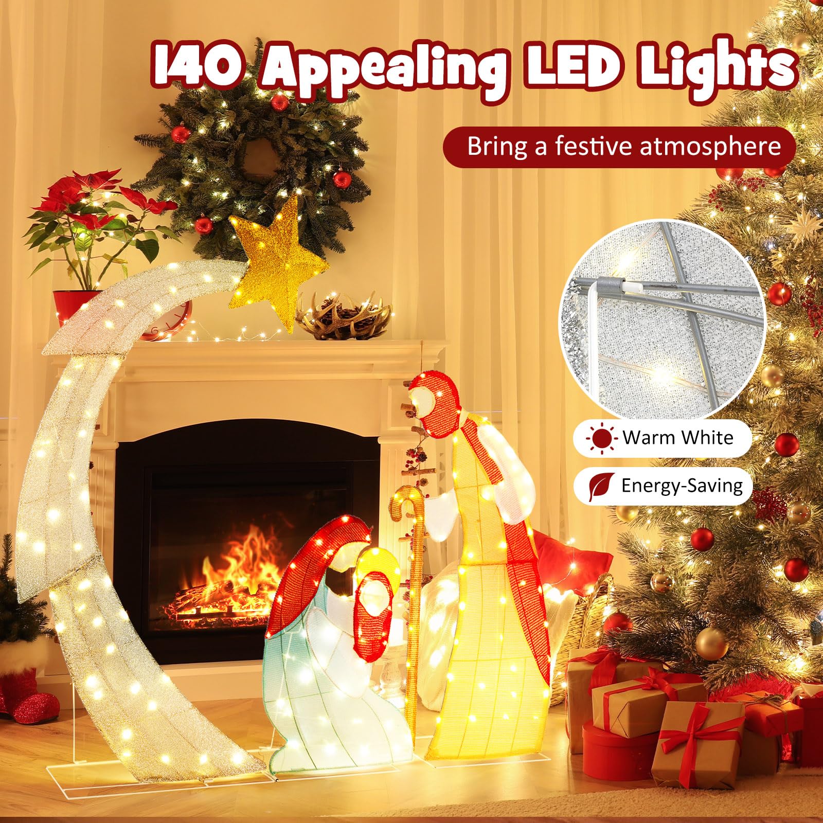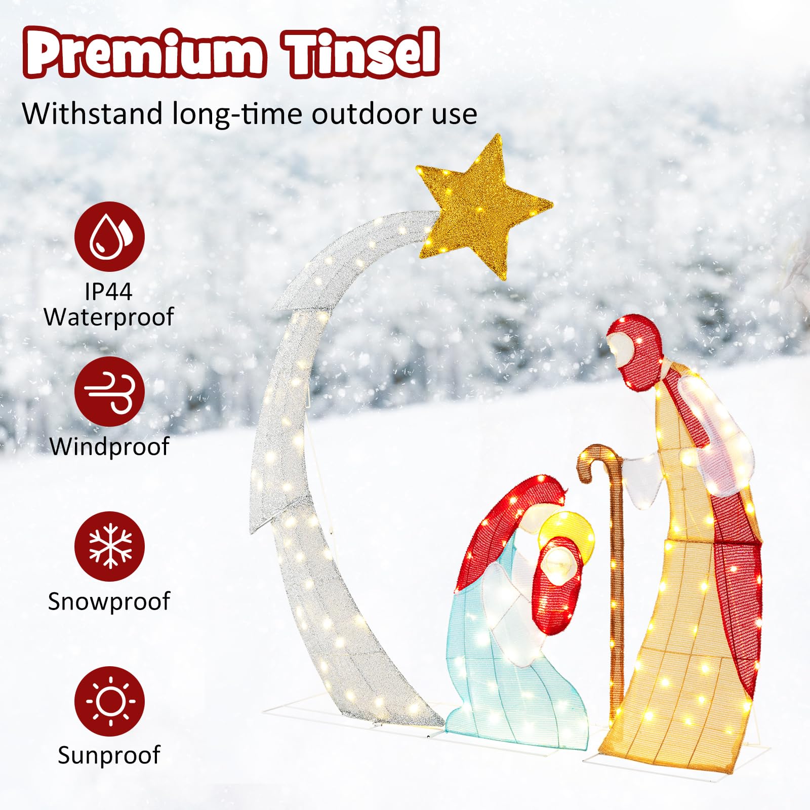 Meticulously designed to bring the sacred story to life, this set features realistic figures of Jesus, Mary, and Joseph under an illuminated Star of Bethlehem. The 140 warm white LED lights add a gentle, welcoming glow. Crafted from high-quality tinsel and metal, the nativity decoration is windproof, snowproof and sunproof. Stability is not a concern as it comes with 10 zip ties and 12 ground stakes for secure installation. Ideal for both indoor and outdoor settings, this nativity scene not only embellishes your space but also embodies the spiritual joy of the season. Let this beautiful nativity set be the highlight of your holiday decorations, ensuring a joyful atmosphere that captivates the hearts of all your guests.