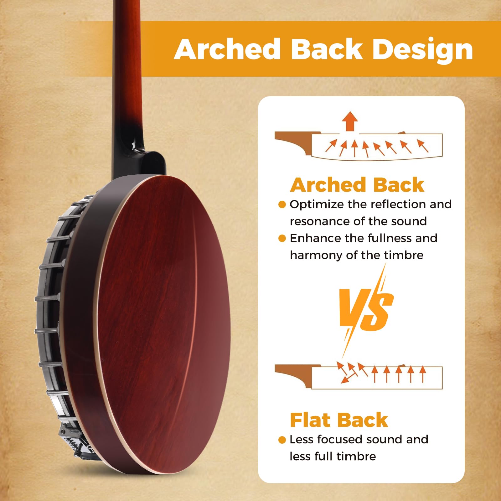 This full-size banjo is equipped with a superior remo drumhead, a Sapele wood resonator, a rosewood fingerboard and bridge, offering a rich and pleasing tone. The detachable back cover design allows you to shift between brighter tones typical for open-back banjos and the fuller, resonant sounds provided by a closed back. You can easily access the drum skins and the internal truss rod for adjustments, ensuring an optimal playing experience. In addition, the 15:1 ratio geared 5th tuner and the included digital tuner make tuning a breeze. Perfectly designed for both beginners and skilled players, this banjo kit comes with rich accessories, including a convenient shoulder strap, a gig bag, a digital tuner, 3 picks, 5 spare strings, 2 wrenches and a wiper.