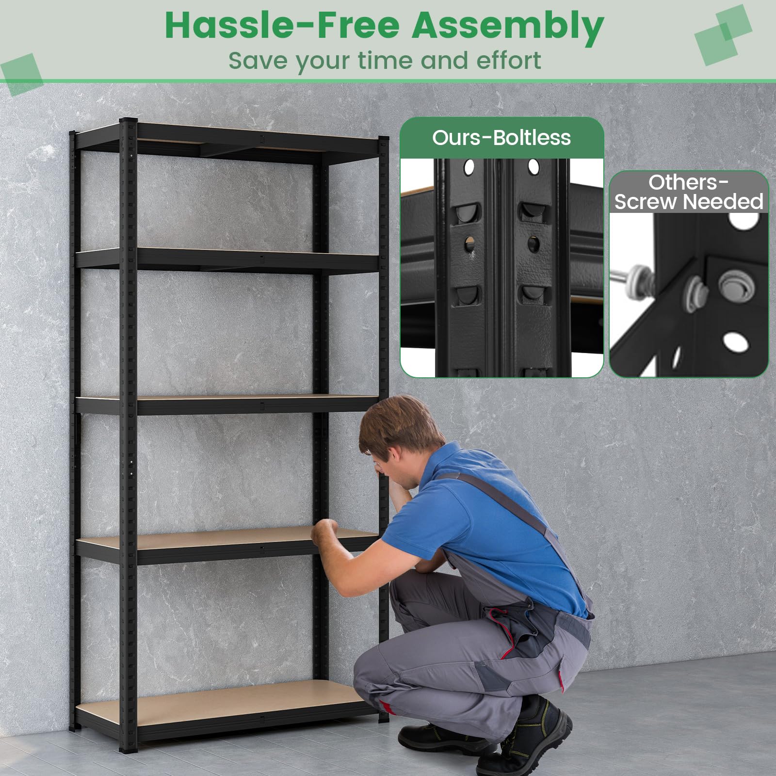 - User-Friendly Details: Different from others with screw needed design, this metal shelf with boltless design ensures hassle-free assembly, saving your time and effort. Moreover, the 2 anti-toppling design highly enhances the safety.