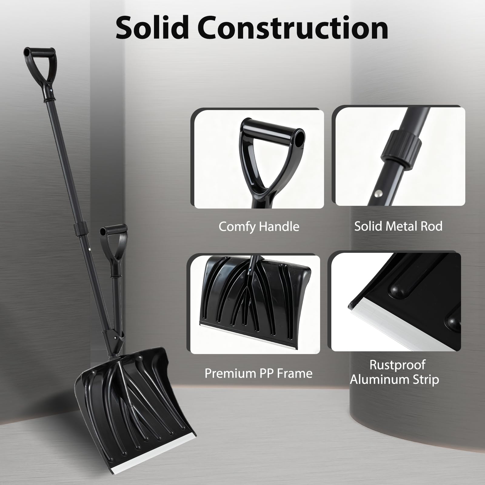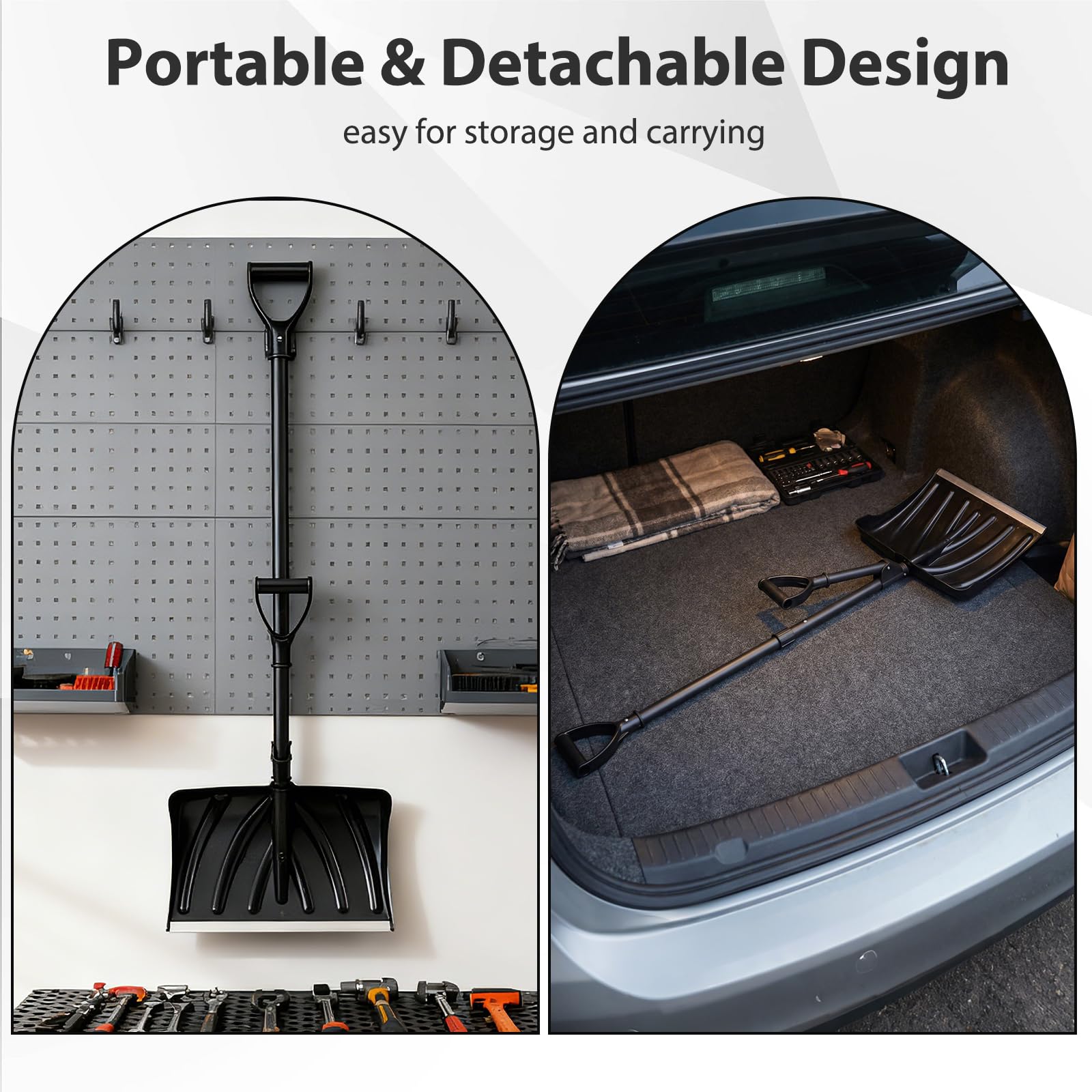 Featuring a broad 18" blade, the snow removal tool easily clears large areas like driveways and walkways, while the sturdy aluminum edge slices smoothly through dense, icy snow. The unique dual-handle setup provides superior leverage and greatly reduces back fatigue, making it the perfect solution for demanding clearing jobs. Lightweight in construction, the shoveling tool conveniently breaks down into 3 parts for compact storage in your garage or vehicle. Whether you're tackling sidewalks at home or prepping for winter travel, this heavy-duty push shovel delivers the reliability and efficiency you need to handle any snow-filled scenario. After the season, you can hang the snow shovel on the wall with the D-grip handle for compact storage.