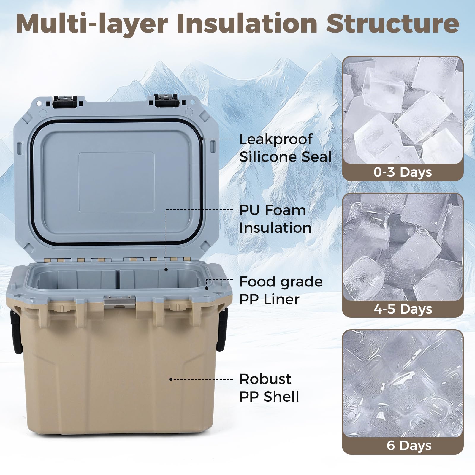 ● Superior Ice Retention: With leakproof silicone seal and PU foam insulation, this retention cooler is engineered to keep ice for an impressive 6 days, ensuring your food and drinks stay cold and fresh for 5-7 days. Moreover, it can also keep warm for 2-3 days during outdoor adventures.