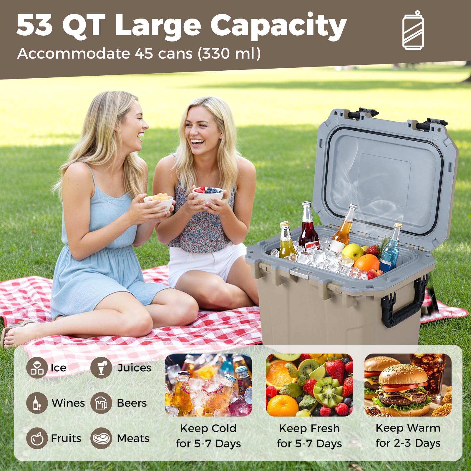 ● Generous Capacity for All Needs: With 53 QT large capacity inside, this ice chest can comfortably accommodate 45 cans (330 ml). You can also use it to hold juices, wines, beers, fresh fruits, or meats to keep your gatherings perfectly stocked.