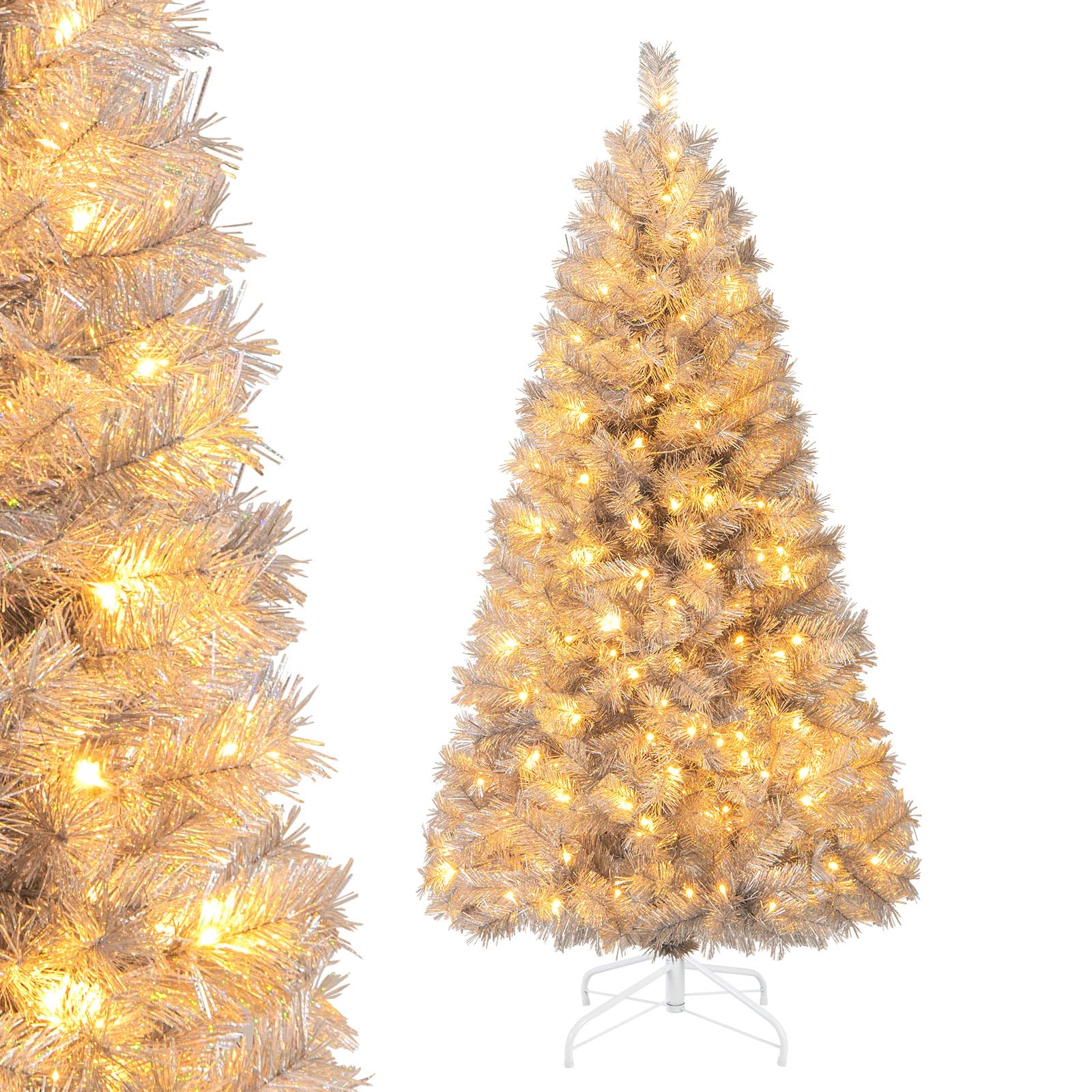 Our 5/6/7 ft pre-lit artificial Christmas tree is adorned with charming silver tinsel leaves, which could beautifully reflect different colors in different lights and angles, bringing a touch of elegance and modernity to your festive decorations. Moreover, it is illuminated with warm white lights, adding a cozy and inviting ambiance. Setting up this tree is a breeze with its 2/3/3-section design and convenient hinged structures that allow branches to automatically spread out, complete with a pre-assembled screw on the foldable base for effortless fixation. Additionally, our tree is crafted from 100% new PVC leaves, supported by a robust crossed metal base, ensuring safe and long-lasting use. This elegant silver tinsel holiday tree is not only perfect for Christmas but also ideal for weddings, parties, or corporate events, allowing you to showcase your creativity year-round!