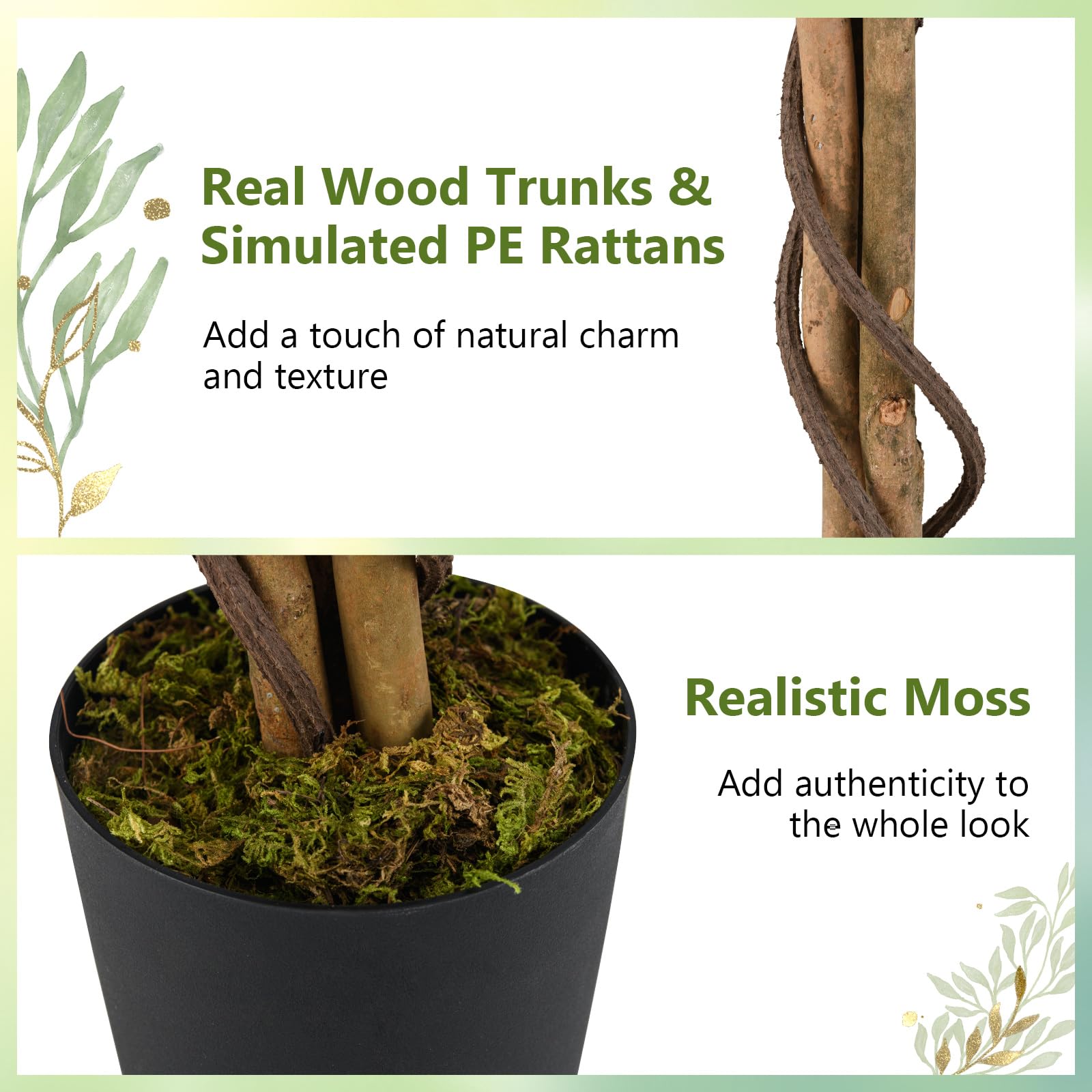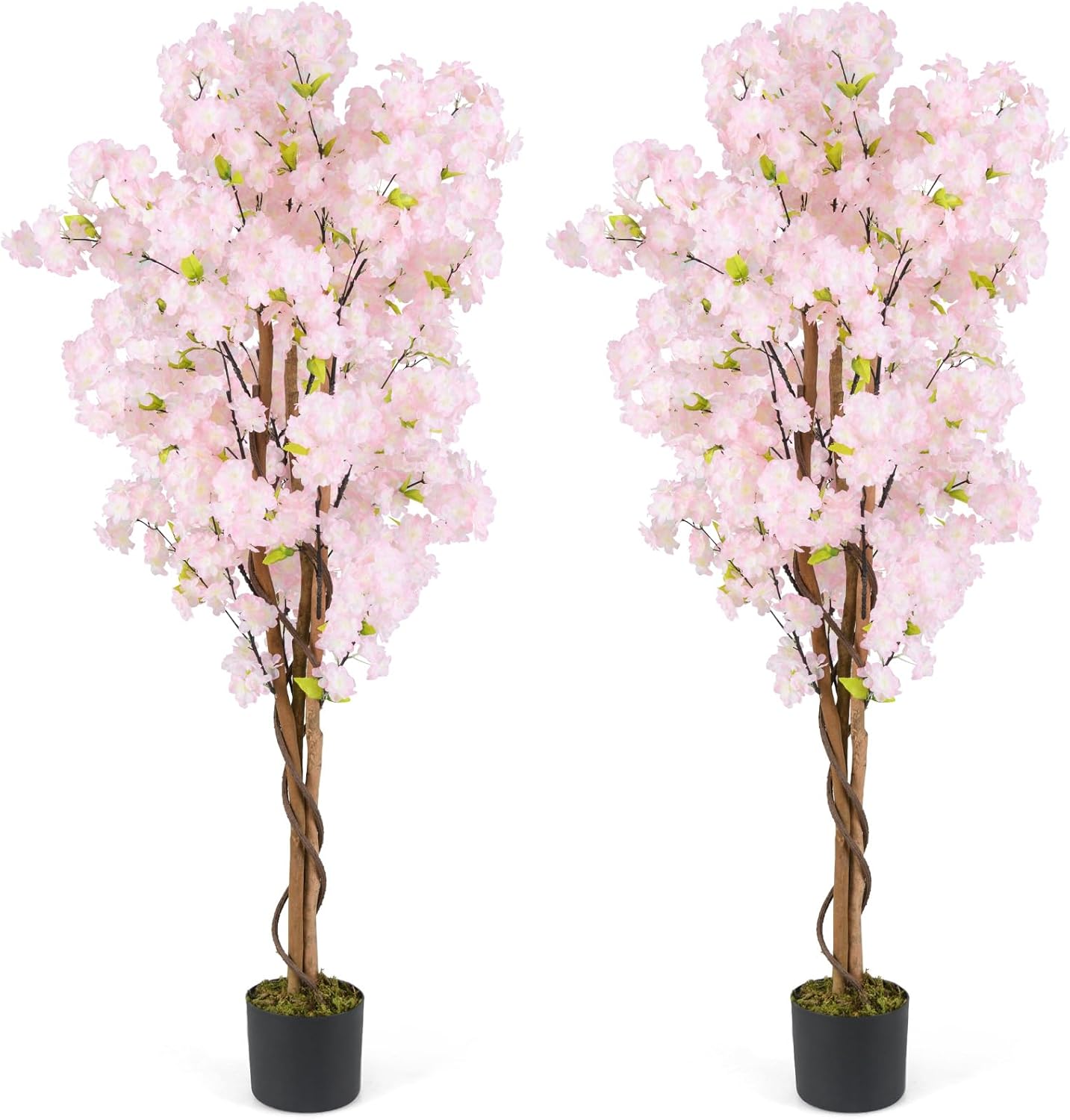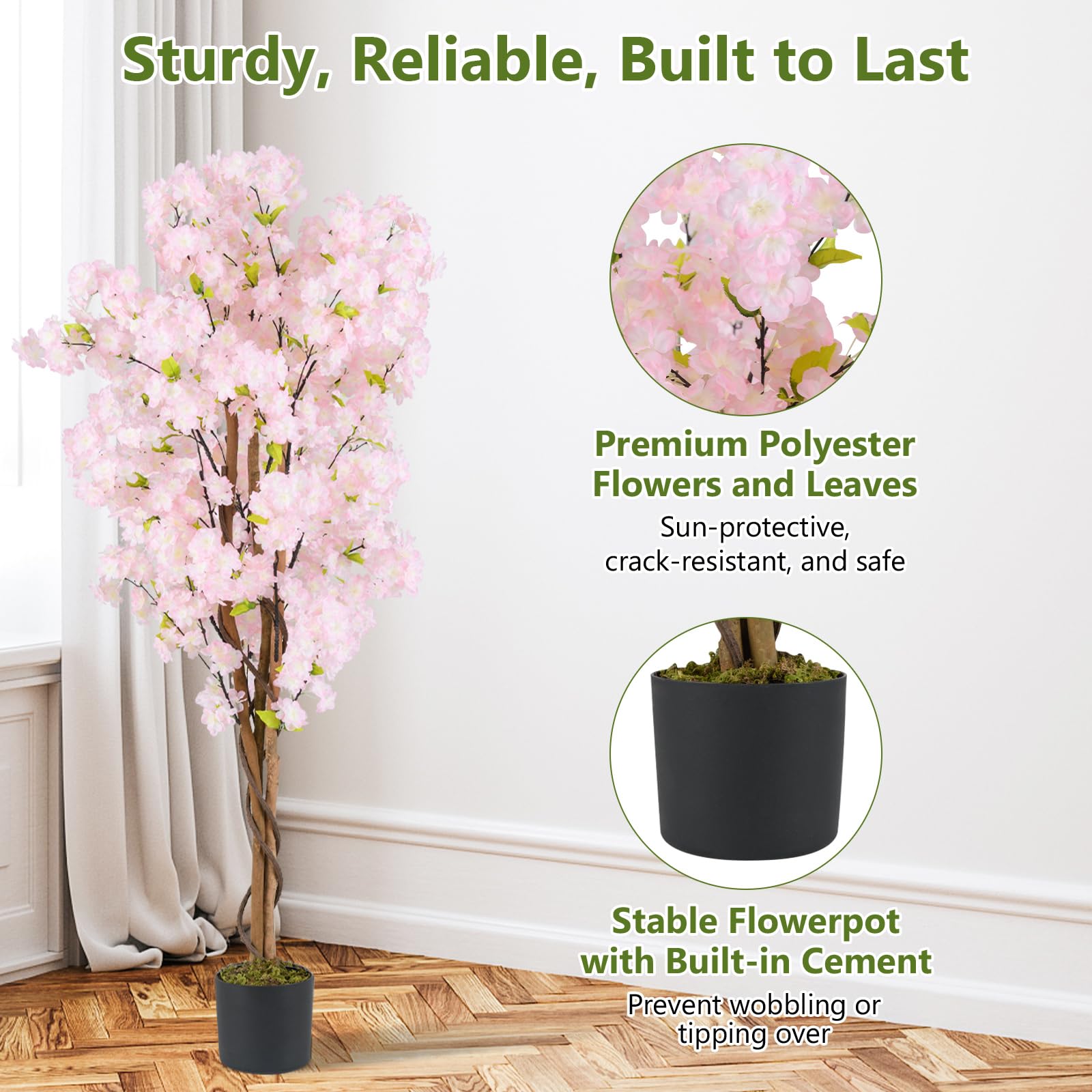 Our 5 ft tall artificial cherry blossom tree adorned with delicate pink cherry blossoms and verdant green leaves beautifully replicates the look of a real cherry blossom tree, complemented with real wood trunks, PE rattans, and moss, bringing the beauty of nature into your home. Crafted of premium polyester fabric, this faux plant is not only visually stunning but also safe and reliable for long-lasting enjoyment. And it requires no maintenance, saving you time and ensuring your space always looks inviting. The included sturdy cement pot provides stability and prevents accidental toppling, giving you peace of mind, especially in households with children or pets. It is ideal for adorning a variety of indoor spaces, from homes to offices, adding a touch of greenery and sophistication.