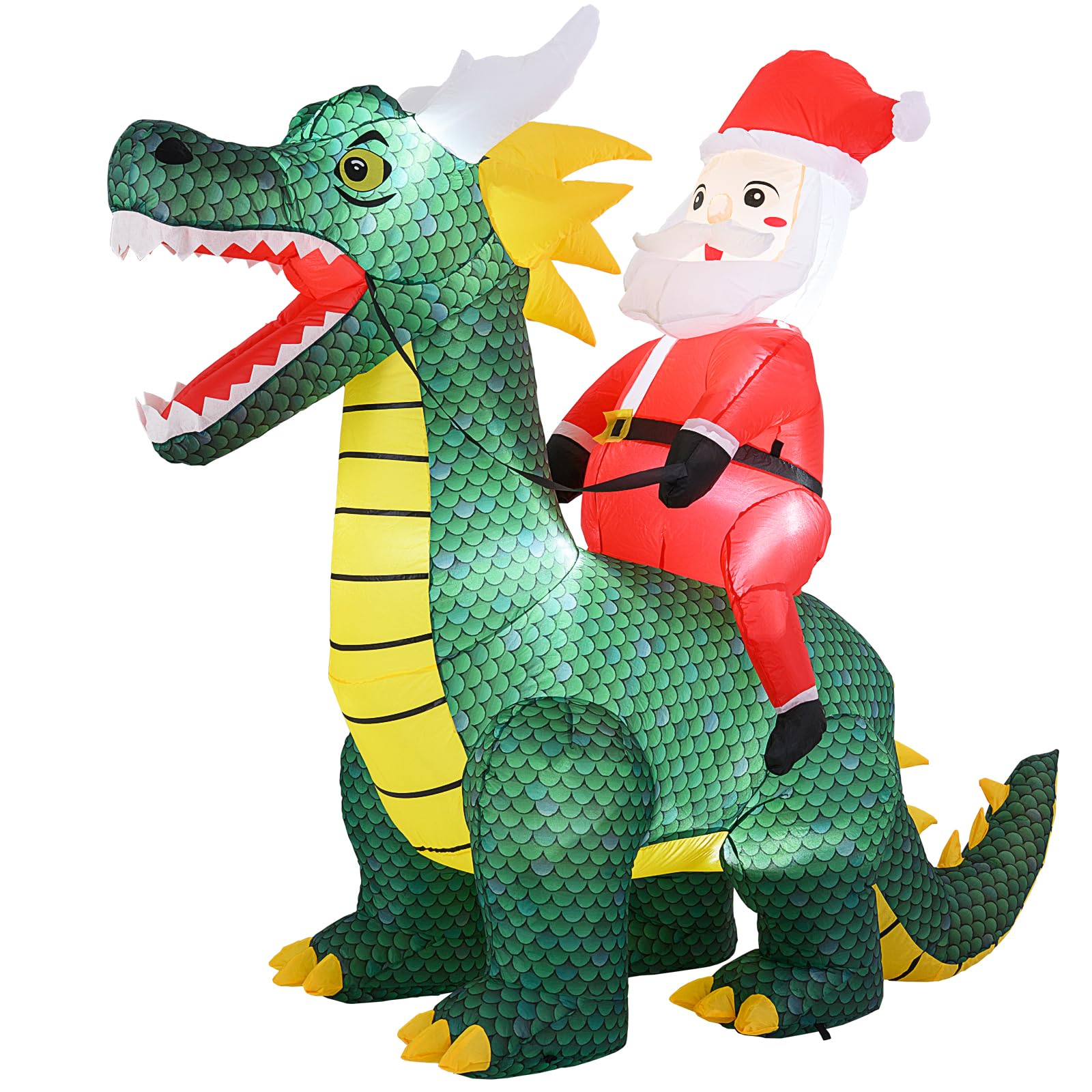 Measuring 6.7 ft long and 6 ft tall, this yard decoration instantly captures attention with its impressive size and lively details. After dark, 5 sets of built-in LED lights cast a brilliant glow across your yard, garden, or market stall, making your display the talk of the neighborhood. Crafted from tough, weatherproof polyester, this dramatic duo inflates itself in just 90 seconds for quick and easy fun, then stays secure with included wind ropes and stakes. Make this season legendary with Santa and his mighty dragon!