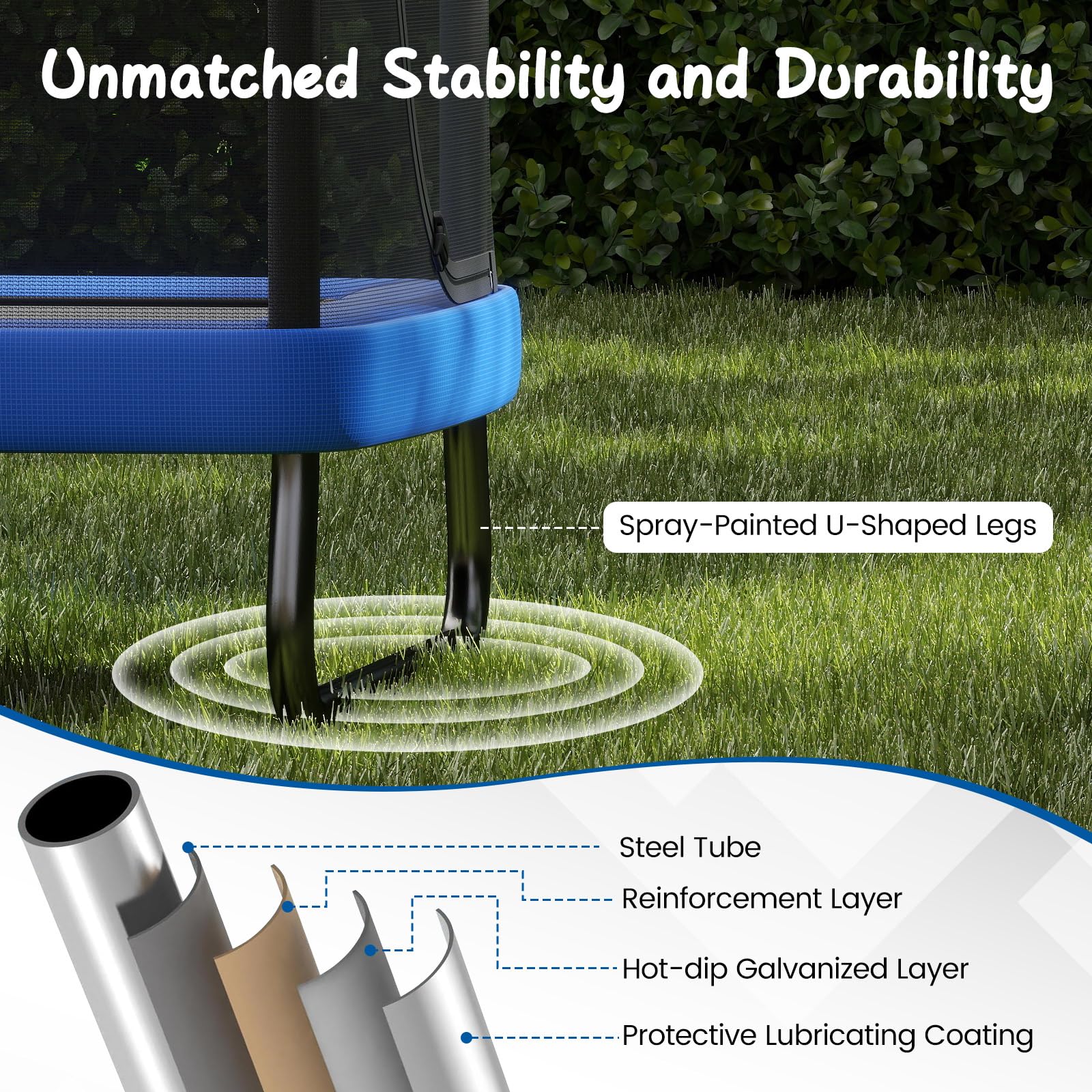 Equipped with a detachable swing and horizontal bar, the backyard trampoline enriches playtime by offering various activities that enhance motor skills. Its elastic PP jumping mat and 32 high-tensile springs ensure dynamic bounce quality. The no-gap design, combined with a padded spring cover, enhances safety, while the hot-dip galvanized frame and spray-painted U-shaped legs contribute to solid stability and lasting durability. To further prioritize children’s safety, the recreational trampoline features an anti-collision foam cover and secure enclosure net with a zippered entry. Suitable for both outdoor and indoor settings, it promises to keep your children active, entertained, and safe.