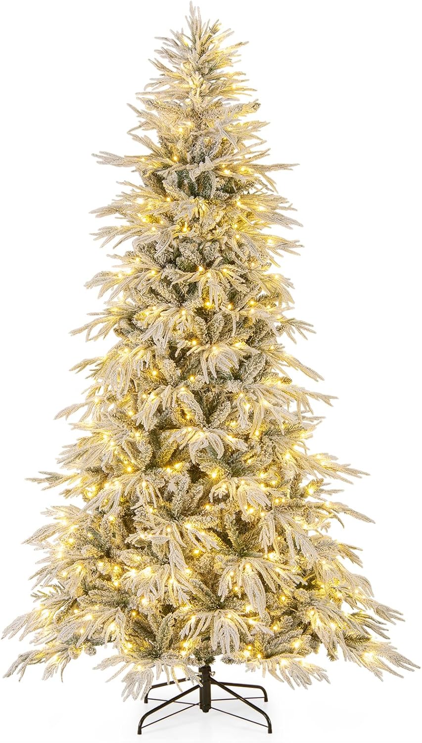 Designed to evoke the serene beauty of a snow-laden landscape, our 6/7/8 ft artificial Christmas tree boasts a dense arrangement of 594/820/1108 lush branch tips, each intricately flocked to mimic the white splendor of a frosty winter morning. Designed for convenience, the tree is pre-lit with 250/340/450 warm white LED lights and features an exquisite blend of soft PE and vibrant PVC leaves, ensuring a festive ambiance with minimal effort. Moreover, this tree is crafted from flame-retardant materials, ensuring durability and safety, and stands on a stable crossed metal base for added security. Installation is straightforward with its hinged branches that lock automatically in place and a convenient 3-section structure for easy storage. This versatile decoration isn’t just suitable for Christmas but also serves as a sophisticated backdrop for various events, such as winter-themed parties or elegant gatherings.