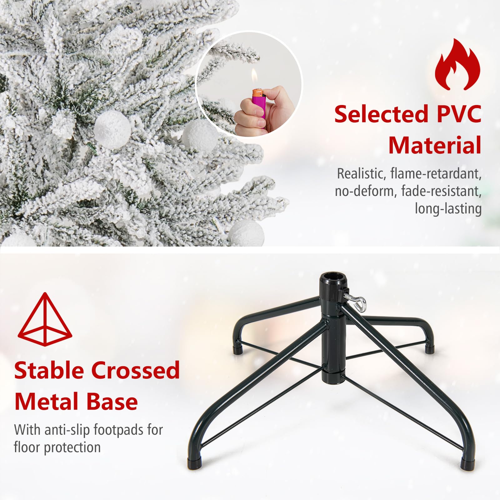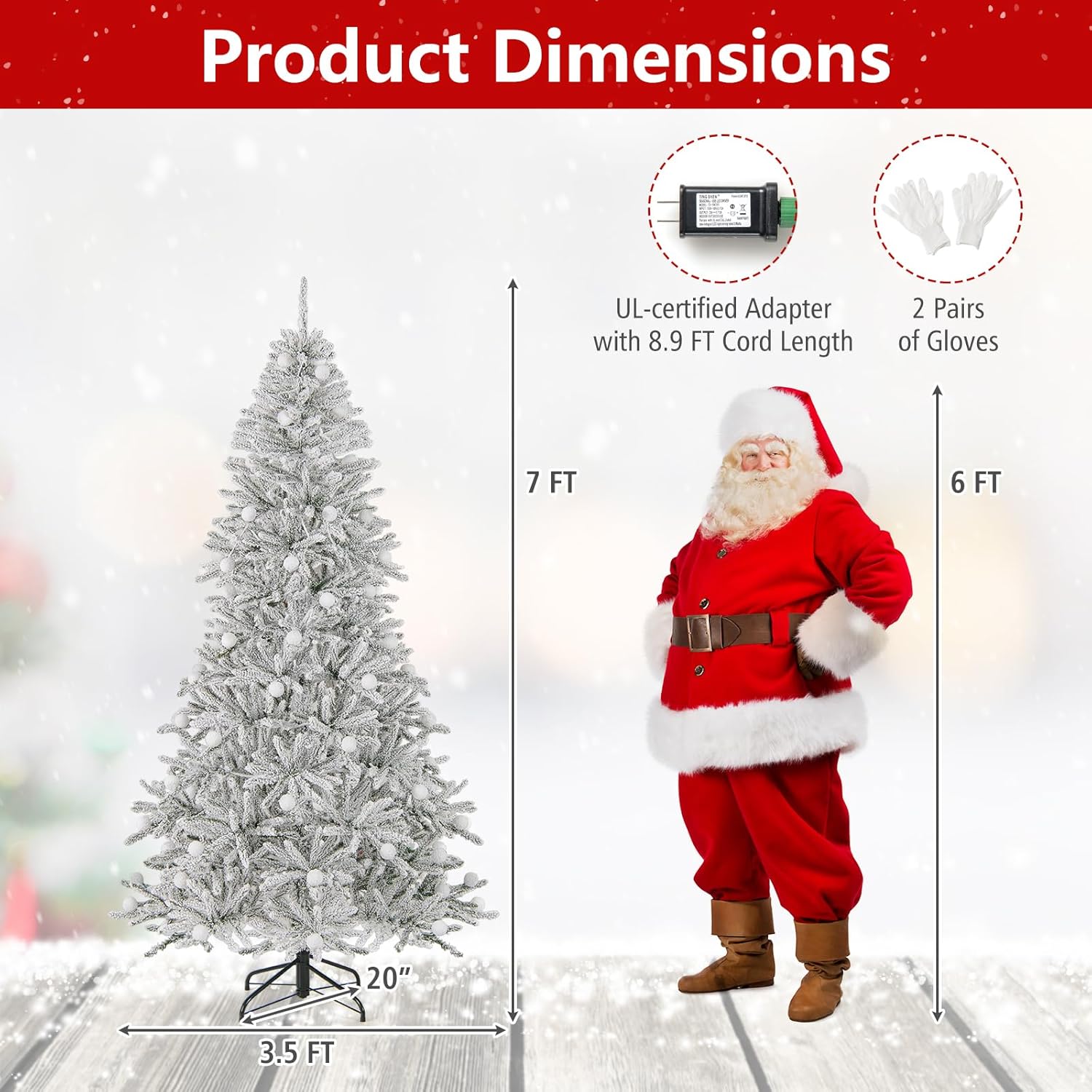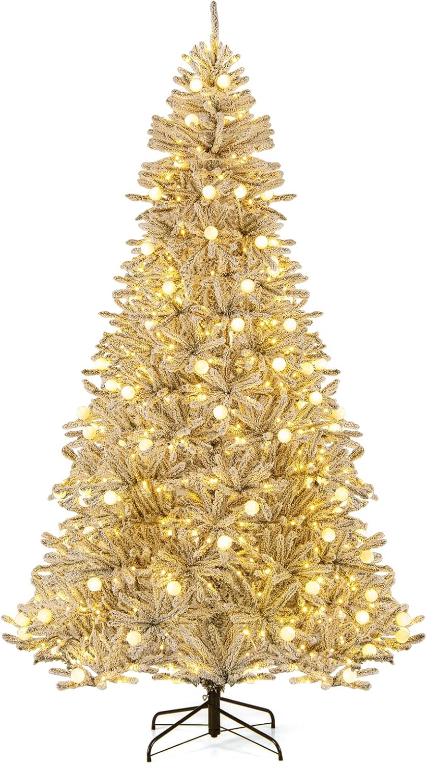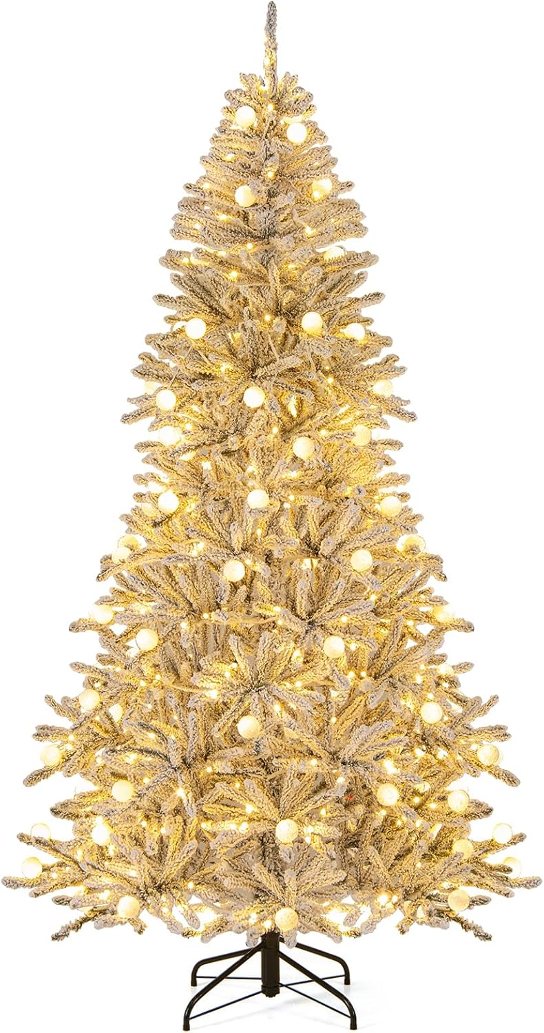 Our 6/7/8 ft pre-lit and pre-decorated Christmas tree stands out with its elegant snow-flocked design featuring 637/905/1273 finely crafted lush PVC branch tips. Pre-lit with a combination of 250/350/450 warm white LED lights and 51/65/81 white globe lights, this tree offers a variety of lighting options, including 3 distinct modes, 5 adjustable brightness levels, and a convenient timer function. Its sturdy crossed metal base ensures stability, while the high-quality, fire-resistant PVC material ensures safety and durability. Designed for easy assembly, the branches are hinged to effortlessly fall into place and the base folds out with a pre-assembled screw, making both setup and storage simple and swift. Ideal for enhancing any holiday setting, this tree brings the beauty of a frosty winter landscape indoors.