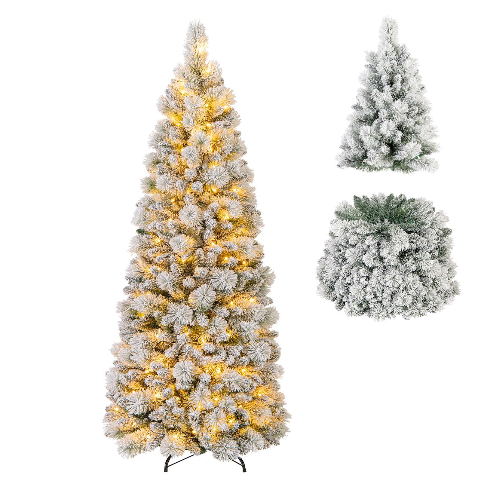 Effortlessly create a stunning winter wonderland in your home or business with our exquisite Christmas tree, which adopts a unique pop structure, ensuring quick setup and convenient storage. More than that, featuring 2 types of leaves dusted with flocked snow, this tree exudes a lifelike beauty that will captivate family and friends alike. And there are pre-strung warm white LED lights that cast a cozy glow, making the tree more charming and beautiful. For safety and durability, our holiday tree adopts flame-retardant PVC leaves and a robust crossed metal base, ensuring a lasting and secure festive display. Embrace the spirit of Christmas with this exquisite tree that brings the beauty of a snowy landscape indoors, making every moment merry and bright.