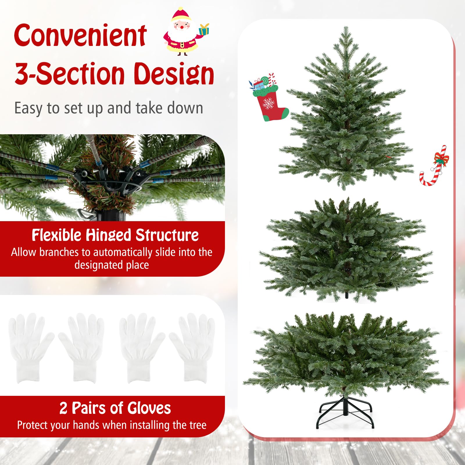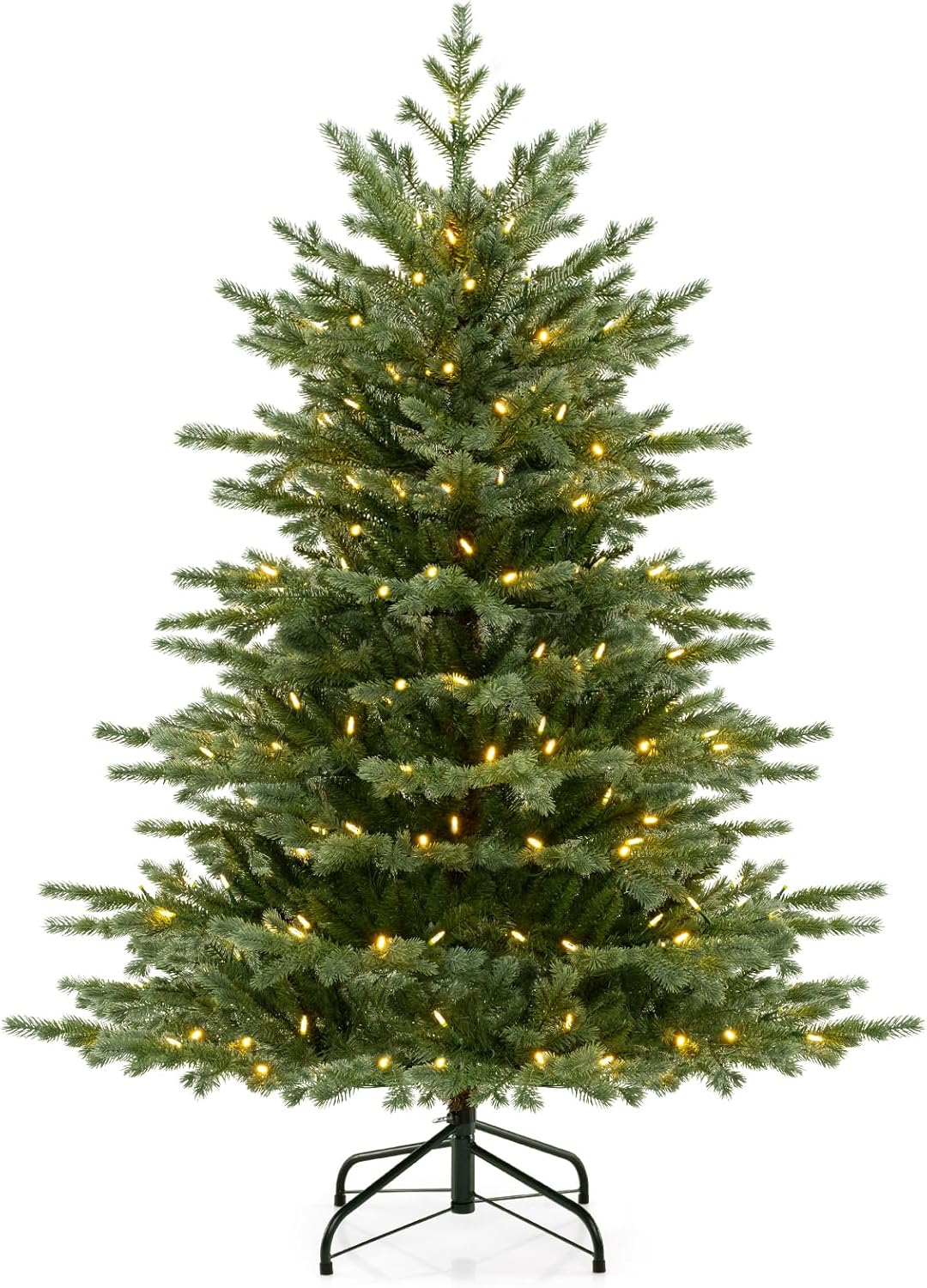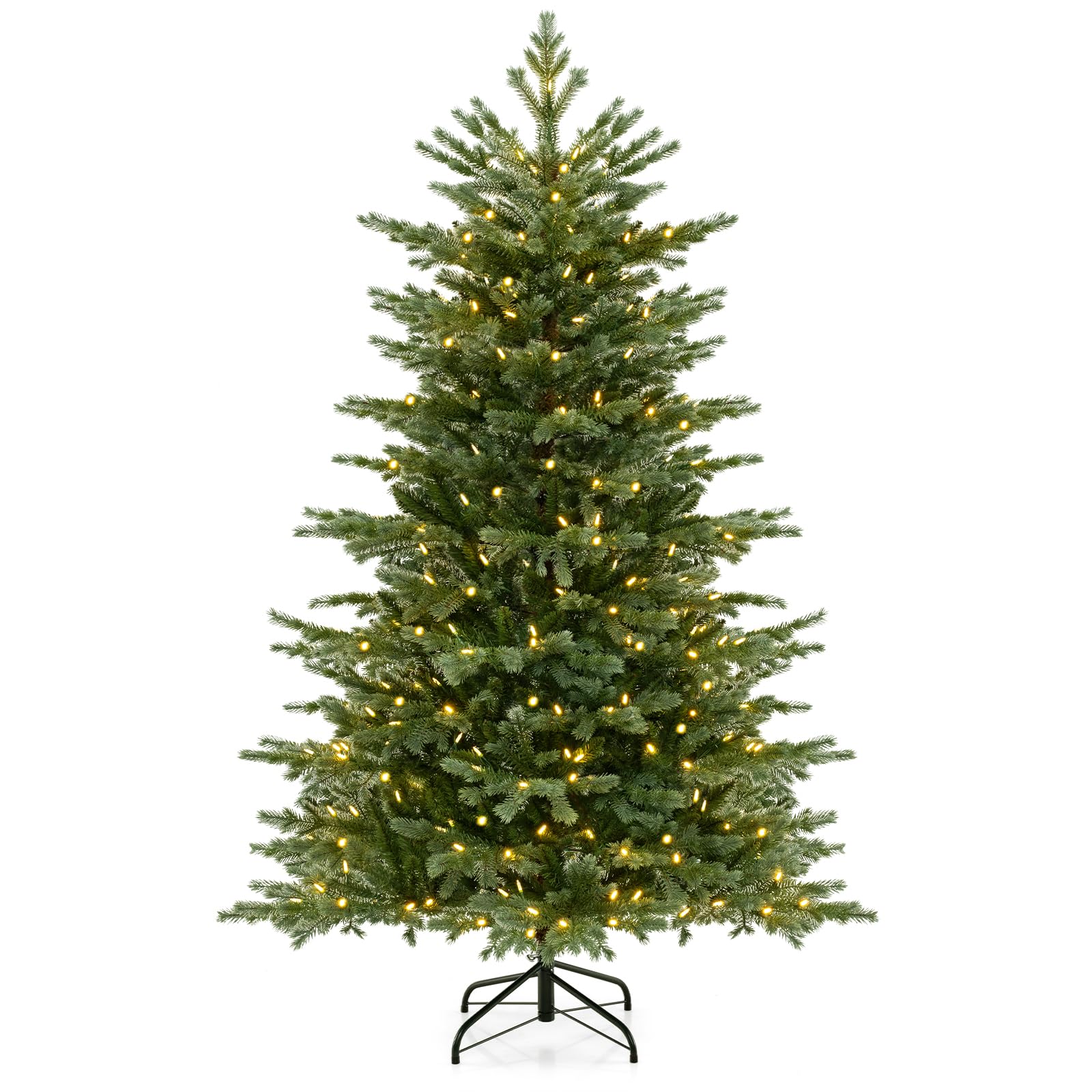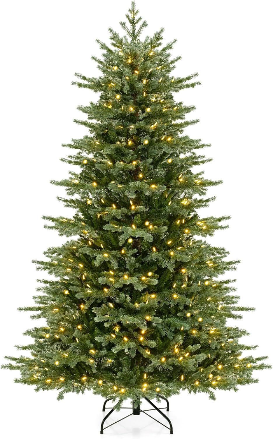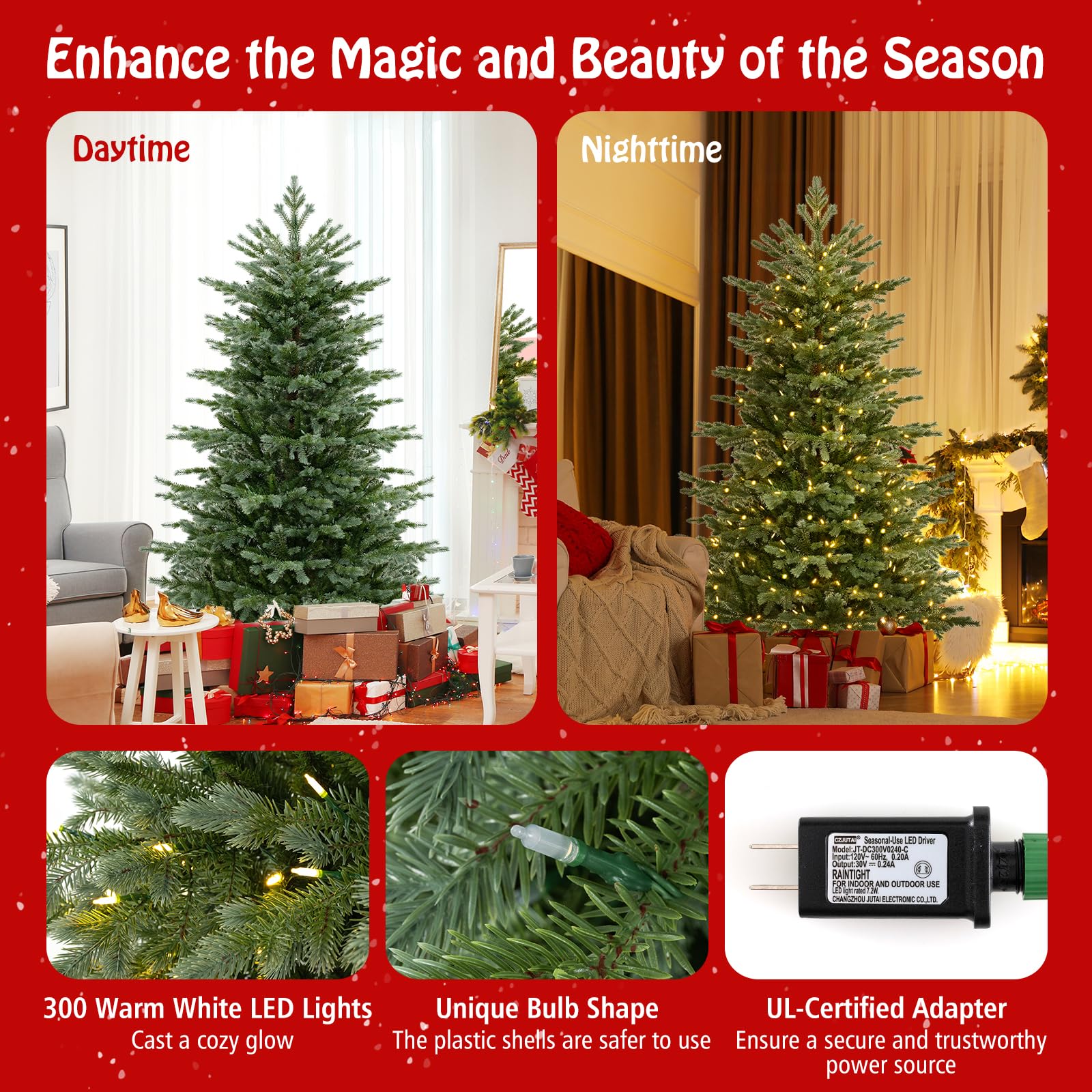 Our deluxe 5/6/7 ft pre-lit artificial Christmas tree stands out with its remarkably dense foliage of 1426/2116/3156 lush branch tips, and there are 2 types of leaves with different colors and shapes for a realistic appearance and feel. Moreover, it could brighten up your space with 200/300/400 pre-strung LED lights that cast a cozy glow, housed in charming bulb-shaped shells for a touch of style. Thanks to its convenient 2/3/3-section design, flexible hinged structures, and a pre-assembled screw on the base, setting up this tree is a breeze. When not in use, it could be detached into a compact size for space-saving storage. Additionally, our tree is crafted from 100% new PVC and PE leaves, supported by a robust crossed metal base, ensuring safe and long-lasting use. Beyond Christmas, this versatile tree is also perfect for various occasions like weddings and parties, adding a touch of elegance and holiday spirit to any setting.