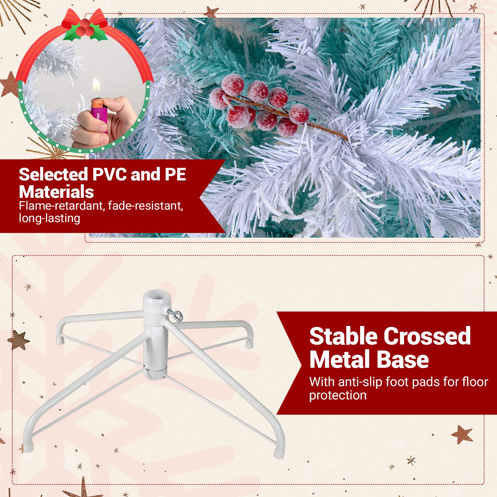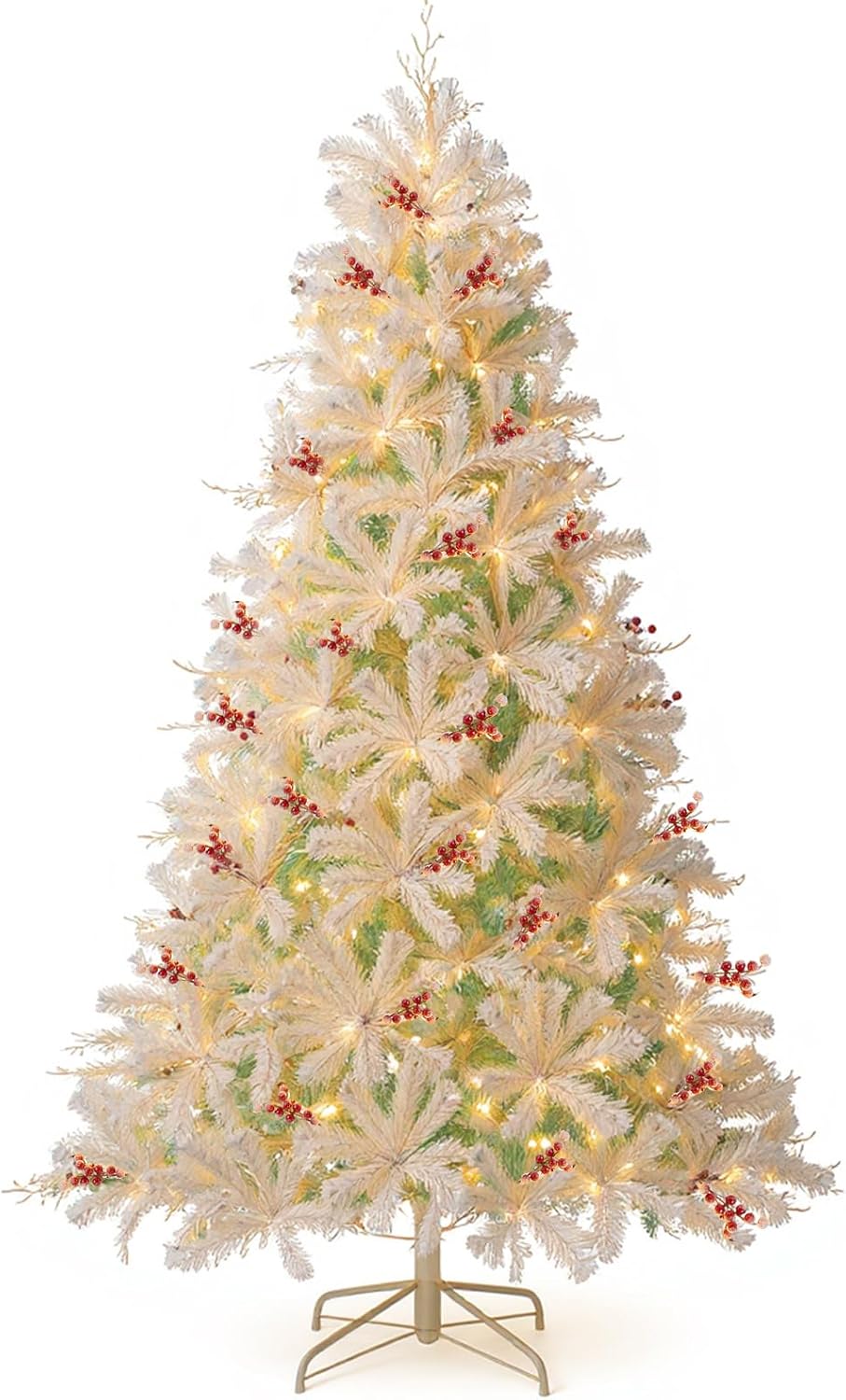 The 6/7 ft Christmas tree features 599/855 branch tips for a full shape. Also, the blend of white and peacock blue leaves that draw immediate attention, enhanced by 33/41 clusters of red berries that evoke holiday cheer. Delicate coral-inspired twigs introduce an elegant flair, complementing the tree’s natural appeal. Moreover, 250/350 warm white LED lights radiate a cozy glow, elevating the festive atmosphere throughout your space. Crafted from vibrant PVC and lifelike PE materials, the foliage is designed to be flame-retardant and non-allergenic. Additionally, 3 detachable trunks with hinged branches will unfold effortlessly to fill its designated spot. Included are 2 pairs of gloves to protect hands while shaping and fluffing branches.