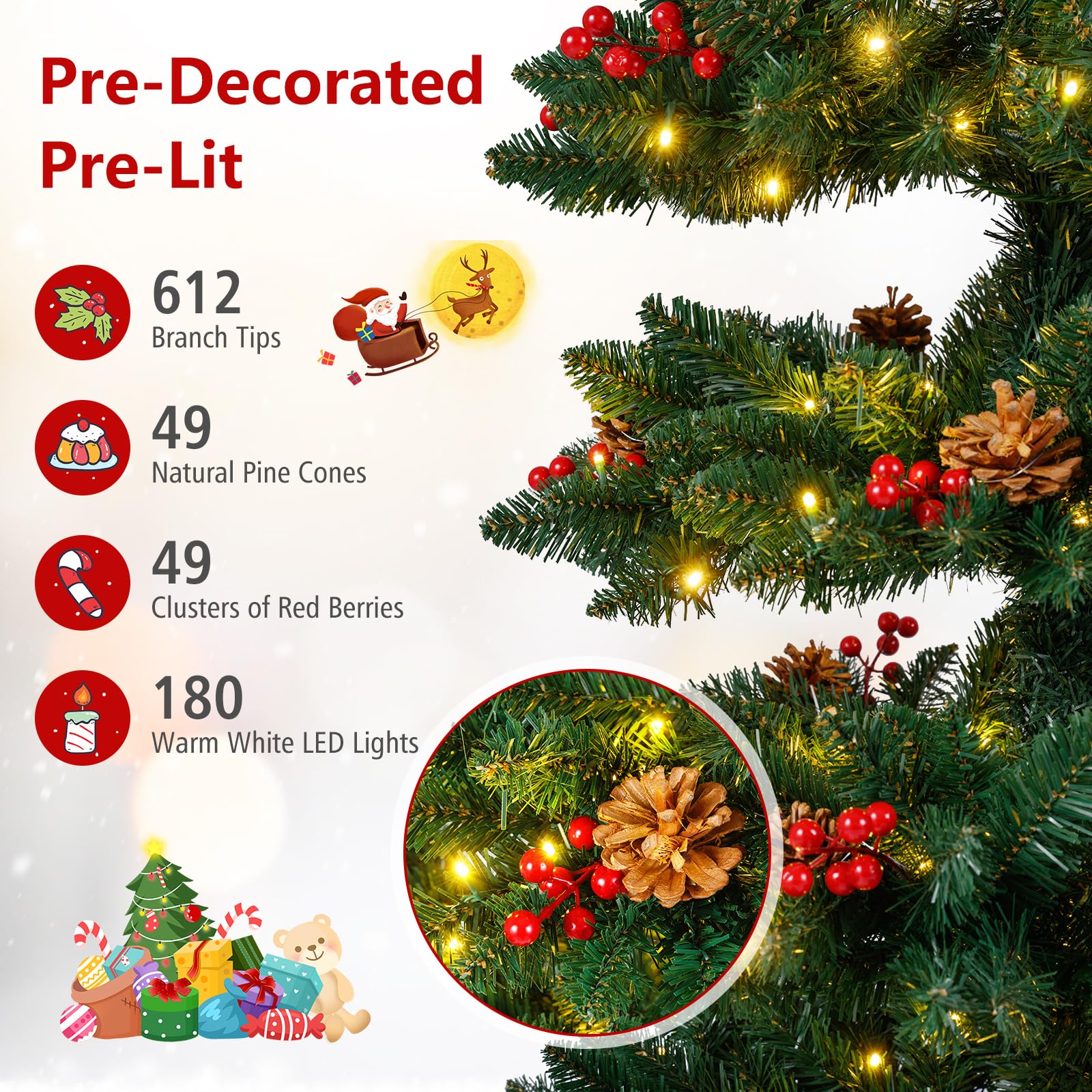 Our 6/7 ft pre-lit artificial Christmas tree with 612/791 lush branch tips arranged artfully in a spiral pattern, offering a lush, eye-catching silhouette that stands out in any setting. Decorated with natural pine cones and clusters of vibrant red berries, the tree glows warmly thanks to 180/220 LED lights with 8 adjustable lighting modes (combination, in waves, sequential, slo-glo, chasing/flash, slow fade, twinkle/flash, steady on) for a custom festive ambiance. Crafted from 100% new PVC, the foliage is fire-resistant, smell-free, and stays beautifully green over time without fading. Supported by a robust crossed metal base and a convenient 3-section structure, both assembly and storage are quick and simple. Perfect for living rooms, office lobbies, entryways, or public event spaces, this lighted tree adds holiday spirit and charm wherever you place it. (Note: The hanging decorations are not included)