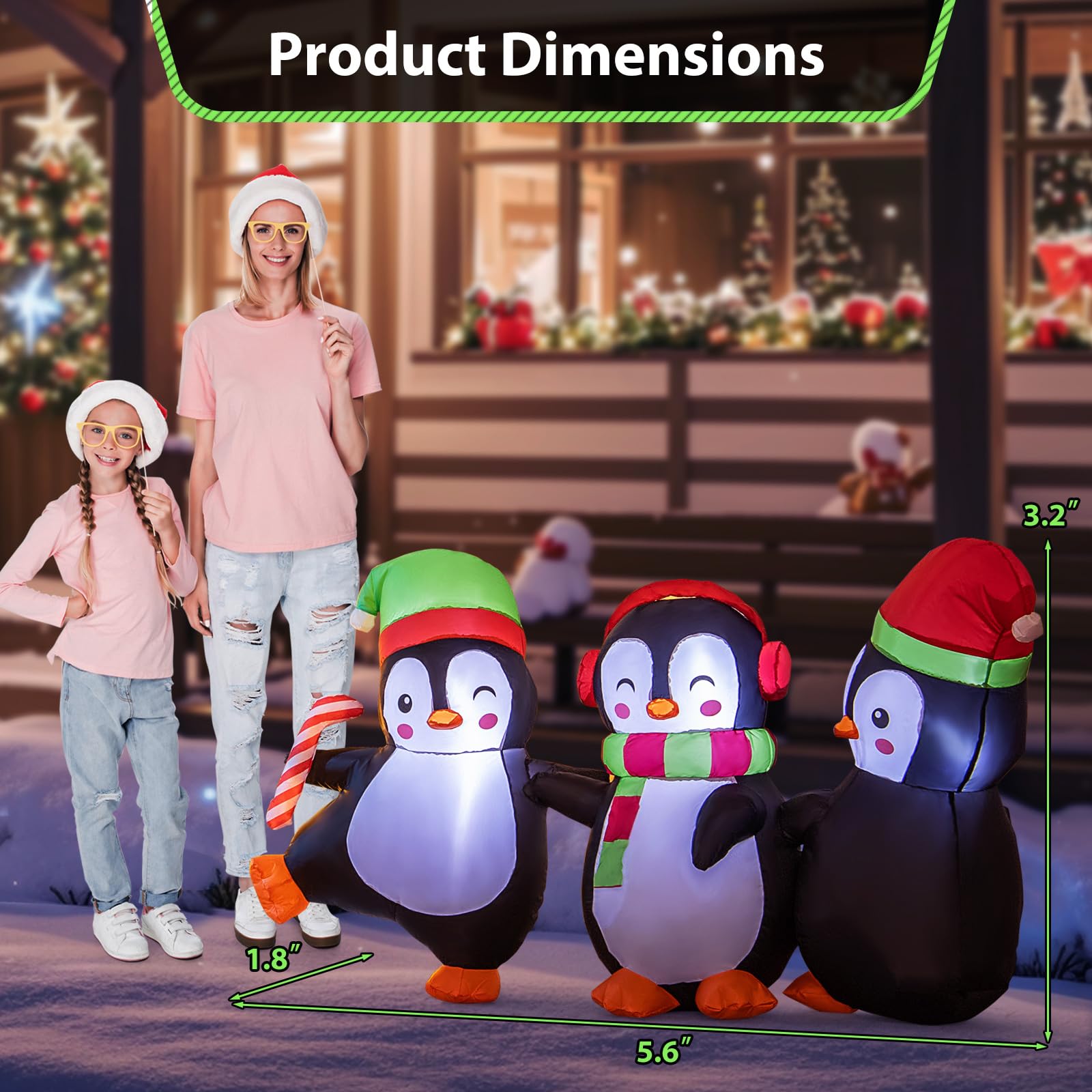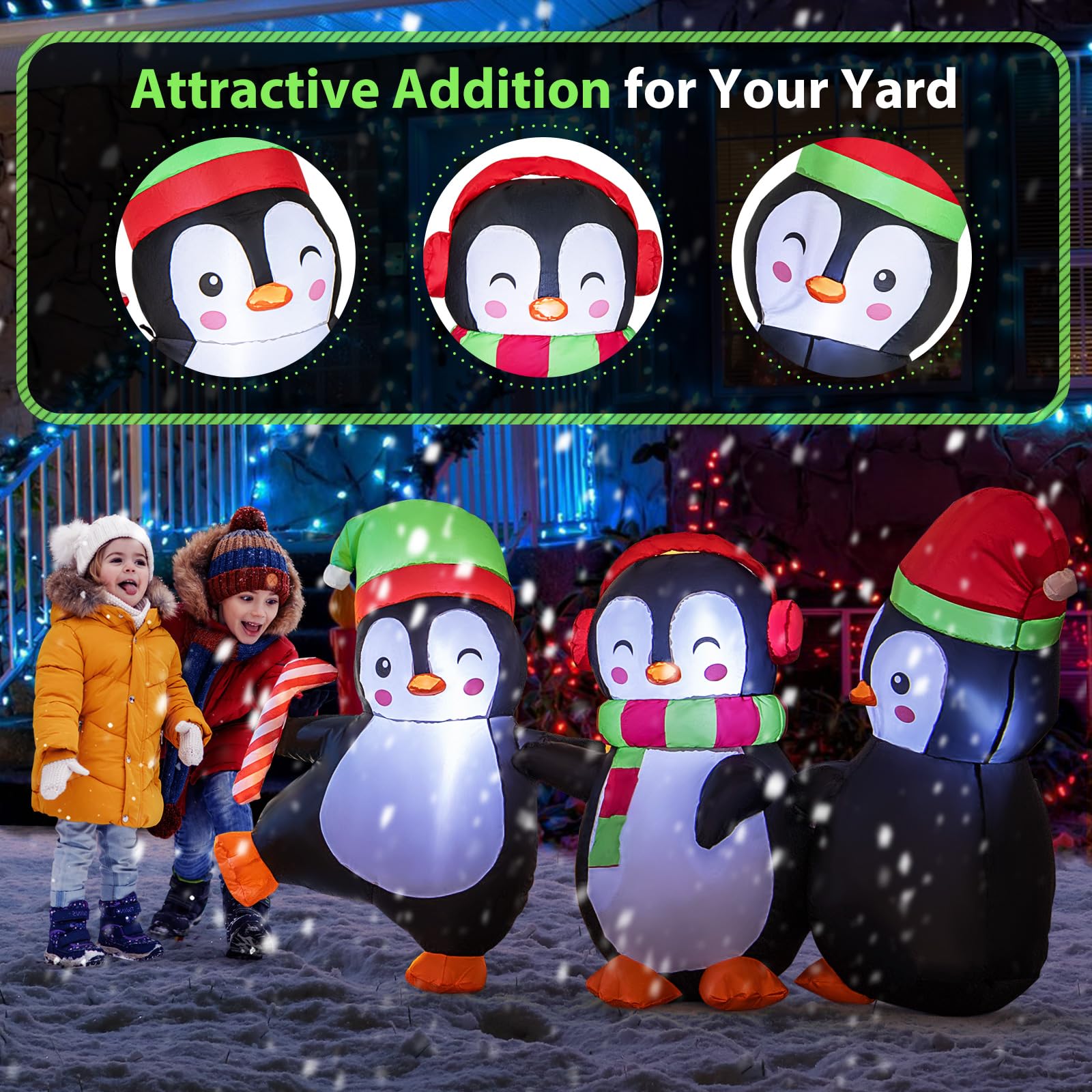 - Adorable Inflatable Penguins: The lighted inflatable penguins hand in hand (2 wearing Santa hats, and 1 wearing headset and scarf) are smiling happily at you. It will become an attractive addition for your yard, lawn, garden or front porch.