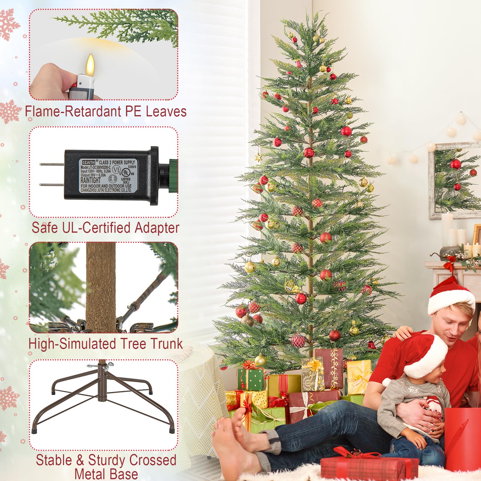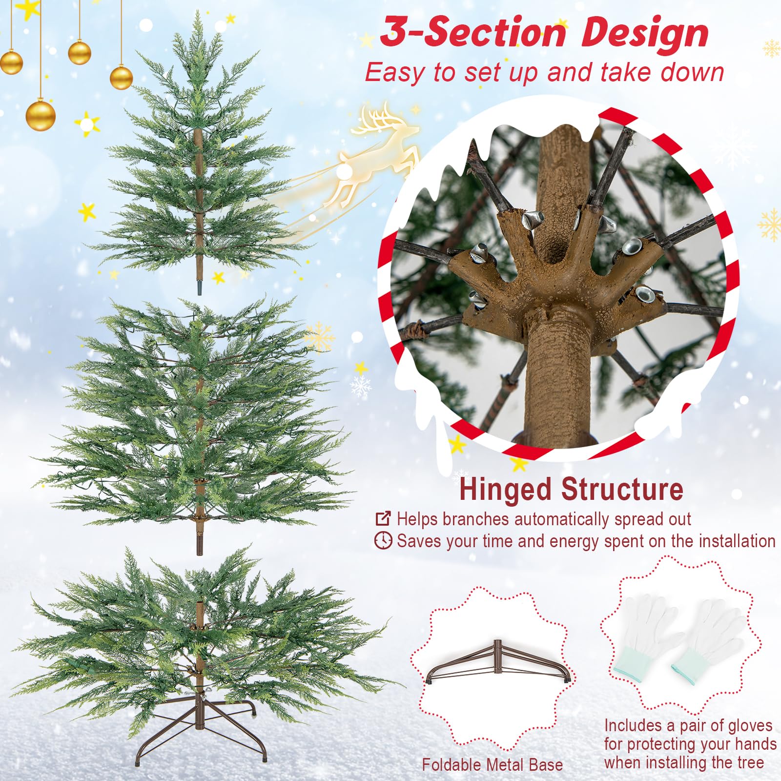 This unique artificial Christmas tree mimics the appearance of a real cypress tree, creating a vivid and natural appearance. Moreover, the PE leaves are designed to mimic the natural variation in color, creating a stunning gradient effect that adds depth and dimension to your tree. Equipped with 540 fairy warm-white LED lights, this tree provides a cozy and inviting glow to enhance the holiday atmosphere. The lights are delicately concealed within the branches for a seamless look. Besides, crafted from fire-resistant PE and supported by a stable crossed metal base, our tree ensures both safety and durability. Furthermore, the hinged structure and 3-sections design make installation a breeze, allowing you to enjoy the festivities in no time. This versatile Christmas tree is suitable for decorating various occasions, adding a touch of holiday charm to your living room, office, or any space that needs a festive touch. Wish you a happy and warm festival time!