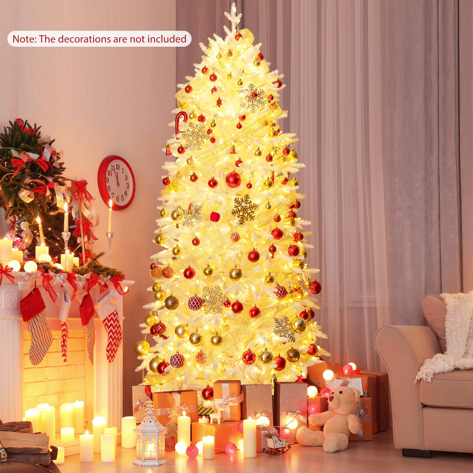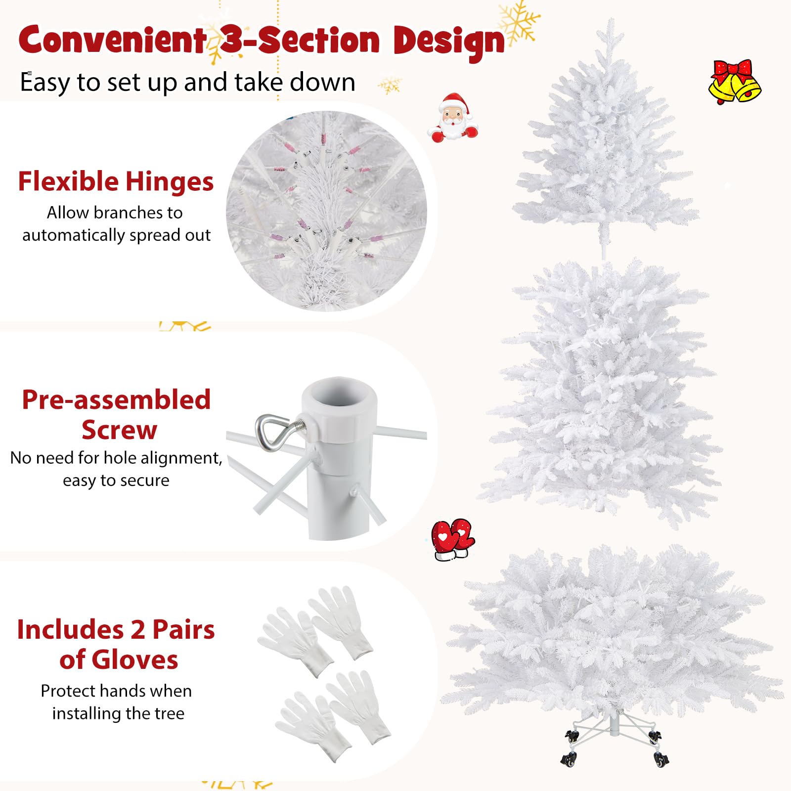 This 7 ft pre-lit artificial Christmas tree stands out with its 1880 lush branch tips, stunning all-white look, and delicate snow flocking, which are designed to bring the enchantment of a white winter indoors. And there are 2 types of leaves with different textures, adding realism and depth to the tree. Moreover, with 900 warm white lights already pre-strung on the tree, creating a cozy and festive ambiance has never been easier. Not only charming but also built for convenience, our tree adopts a stable crossed metal base with 4 lockable wheels, ensuring effortless mobility and positioning. Assembly is a breeze, thanks to its convenient 3-section design with hinged branches and a pre-assembled screw on the base that requires minimal effort to set up. Crafted from premium flame-retardant PVC and PE materials, this Xmas tree combines the best of beauty and safety. Make this holiday unforgettable with a centerpiece that embodies the joy and splendor of Christmas.