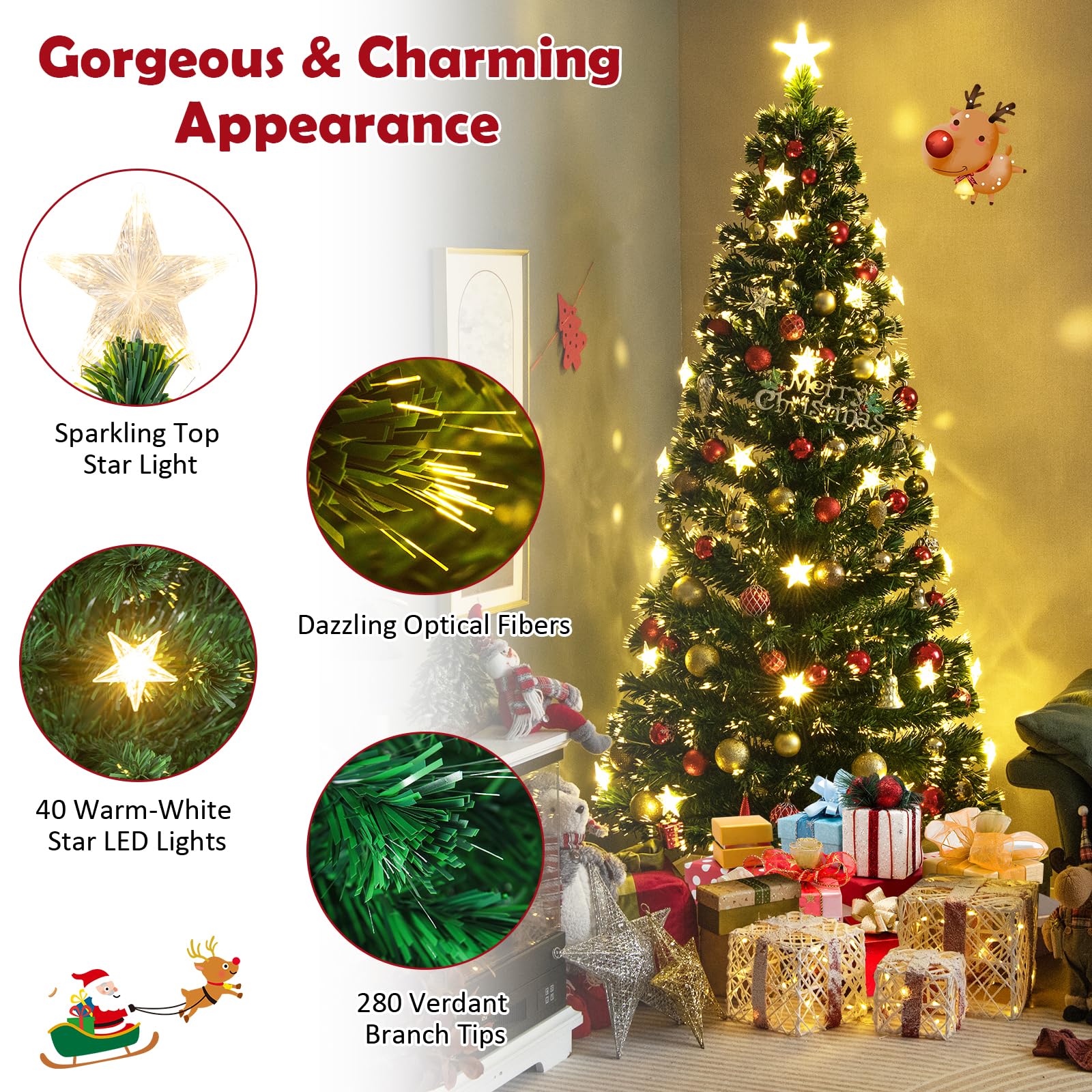 Our 7 ft pre-lit fiber optic artificial Christmas tree allows you to enjoy a joyful and lucky vibe with your family or friends, adding charm to your Xmas holiday. The tree is adorned with dazzling optical fibers and warm-white star LED lights, bringing a vibrant feel of Christmas into your home. And there exist 8 lighting modes for you to choose from. Moreover, designed with 280 lush branch tips, it looks vivid and full-bodied. And the leaves are crafted with high-quality PVC material that is non-flammable, crack-resistant, durable, non-odor, non-allergic, and durable, ensuring long service life. The cross-shaped metal base provides great support and ensures balance, keeping the tree upright and preventing breakage. Our lighted Christmas tree is suitable for various occasions, such as homes, offices, stores, coffee shops, schools, and more.
