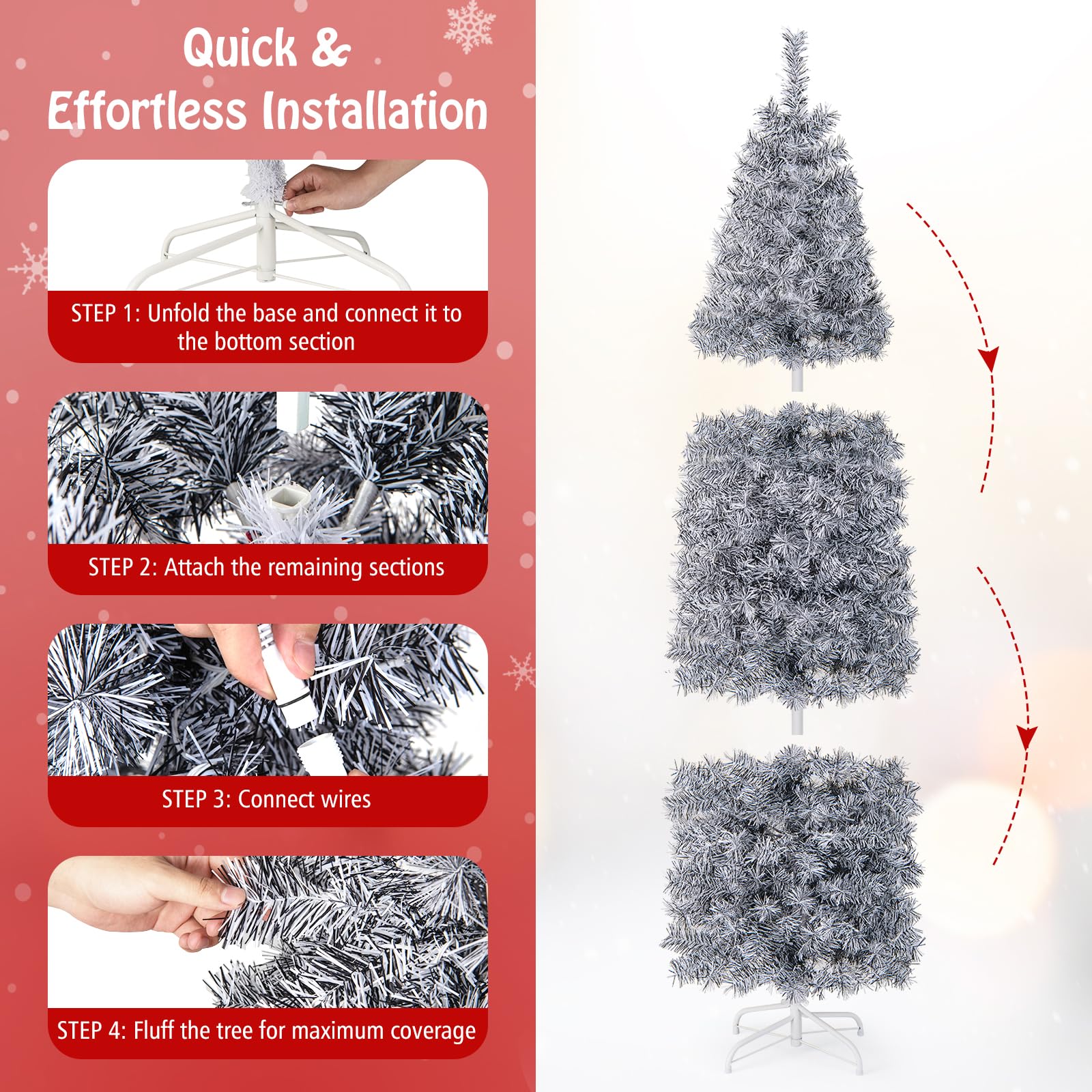 Transform your holiday decoration with our stunning white and black lighted Christmas tree. The 670 lush branch tips, elegantly adorned with black and white leaves, create a unique and eye-catching aesthetic. And with 350 cool-white LED lights, this tree radiates a cool and crisp glow. Versatile and perfect for any setting, our slim pencil Christmas tree is ideal for smaller spaces or as an additional decorative piece. Whether it's for your home, office, or event, this white and black lighted Christmas tree will add a touch of elegance and modernity to your holiday celebrations.