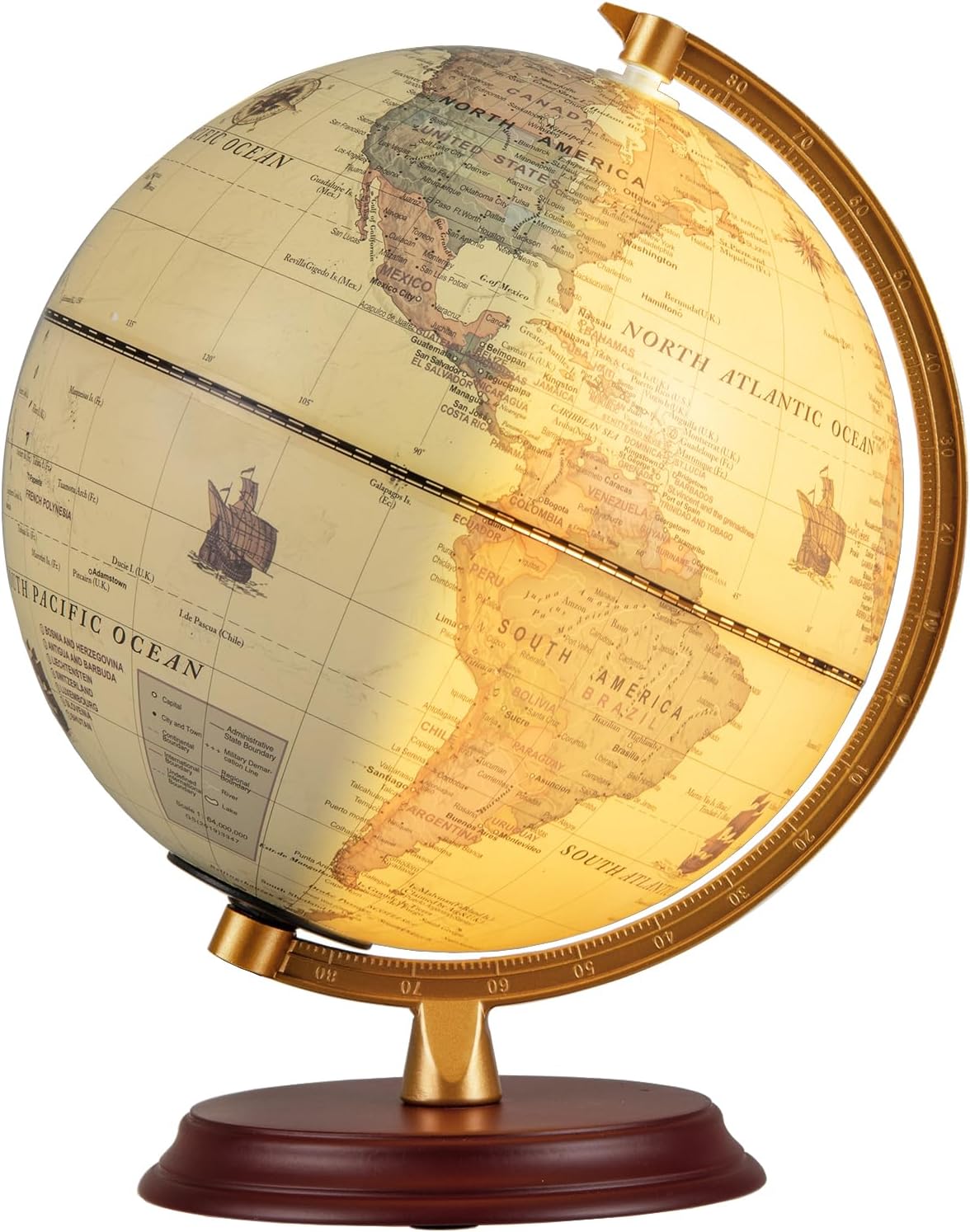 The gentle light not only accentuates its detailed high-definition display but also adds a touch of visual appeal. With a smooth 360° rotation feature, altitude markings, and a time-zone dial, this globe offers an educational exploration of Earth. Crafted with a sturdy metal frame and set on an elegant wooden base with anti-slip pads, it ensures stability and durability. Whether as a decorative piece, a night light, or a learning tool, this globe's versatility makes it a perfect addition to any setting.