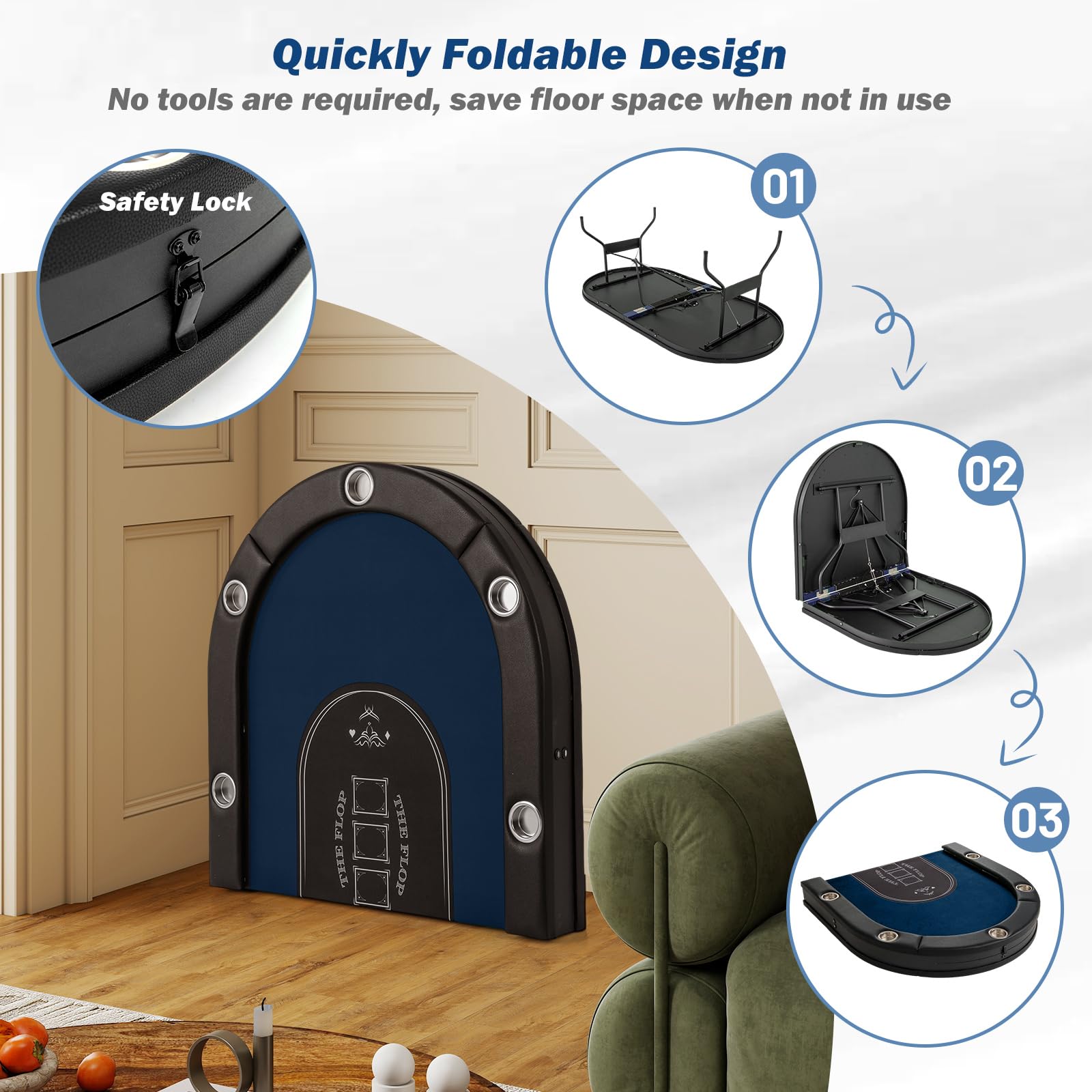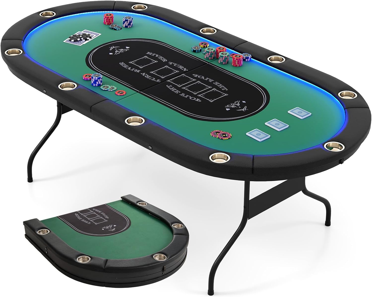 Bring the excitement of Las Vegas into your home with our LED poker table, designed to comfortably seat up to 10 players for a wide range of card games like Blackjack and Texas Hold'em. Moreover, this table sets the mood with integrated ambient blue LED lighting, enhanced by a convenient USB charging port for uninterrupted play. The playing surface is made from soft casino-grade felt with a thick cushioned armrest wrapped in PU leather, providing both comfort and a quiet surface that reduces noise during play. Each player has access to an individual stainless steel cup holder, deep enough to secure beverages and keep the action clean and dry. When not in use, the table can be quickly folded and locked, making it easy to store or take outdoors for a game night under the stars. Our poker table is an essential addition for any serious card player looking to recreate the feel of a casino from the comfort of their own home.