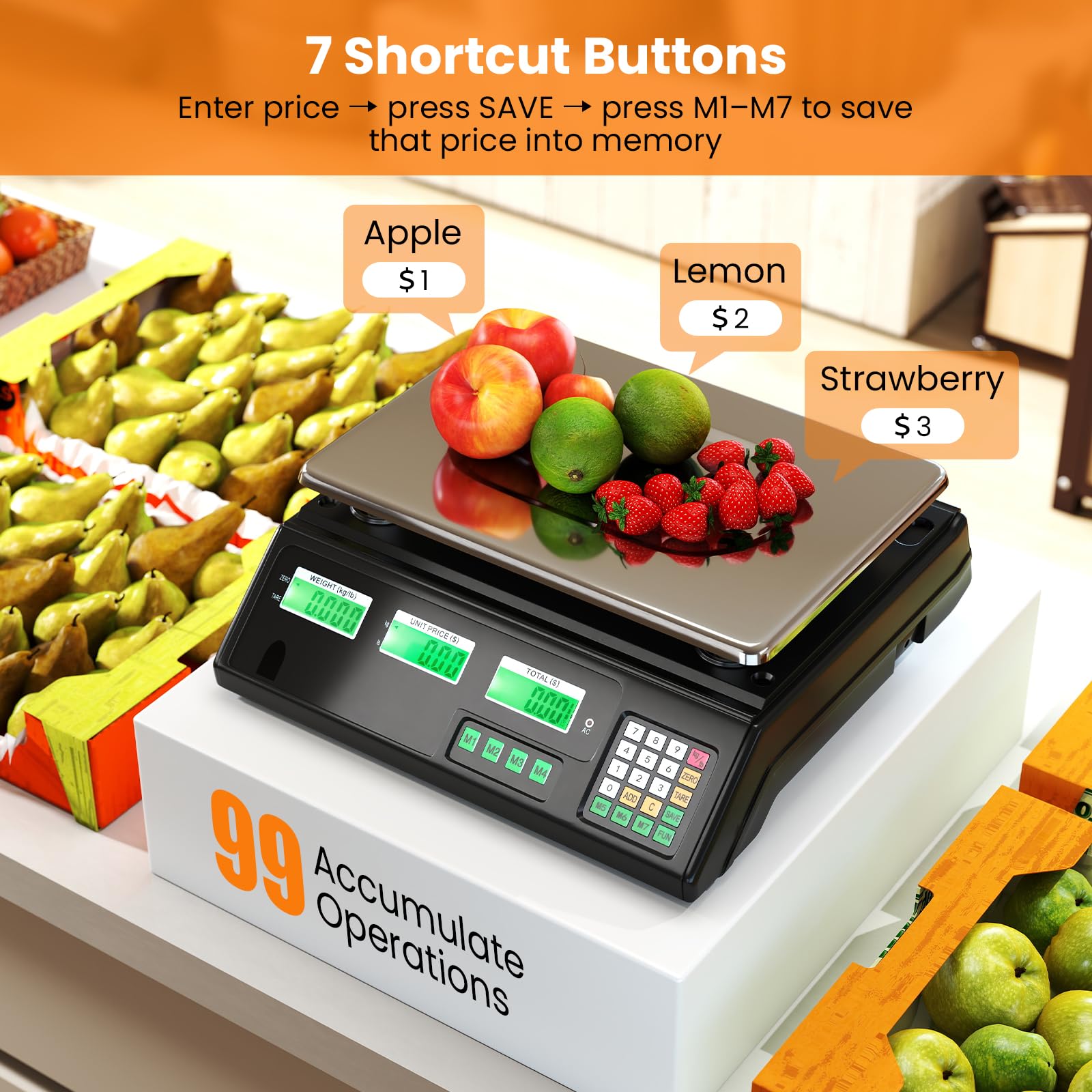 This commercial food scale features a stainless steel platform that is easy to clean and a high-impact ABS housing built for long-lasting use. It offers a dual-screen transparent transaction with front and back LCDs that clearly display weight, unit price and total to both sellers and buyers. The weight scale for food provides versatile one-touch multi-function operation, including lb/kg switching, parts-counting mode, shortcut buttons to save unit prices and accumulated operations for efficient processing. Additionally, the food scale supports a reliable dual power system with a built-in rechargeable battery and AC adapter, allowing up to 100 hours of continuous use.