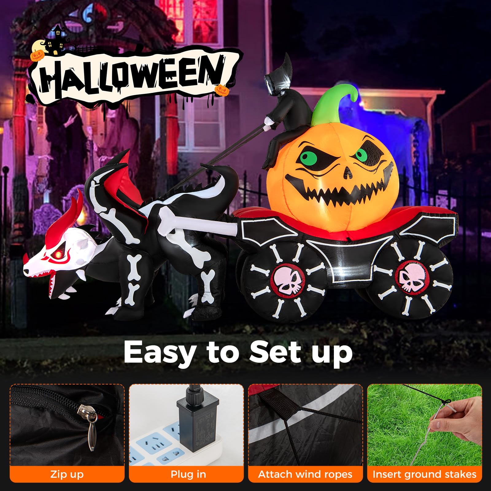 This 9-foot-long grim reaper driving a pumpkin carriage brightens up your outdoor space with 7 built-in LED lights. Made from weather-resistant polyester fabric, the blow up carriage is designed to withstand the elements while spreading spooky fun to those who pass by. The Halloween inflatable is easy to set up with the self-inflating design. When the festivities are over, you can simply deflate and store it for convenience. The blow up decoration is perfect for a variety of Halloween activities, creating a haunted landscape that is sure to impress.