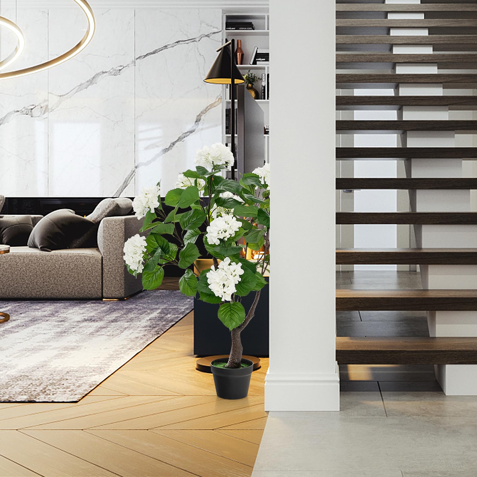 Adorned with 11 vibrant hydrangea flowers and lush green leaves, this faux flower tree perfectly captures the essence of a real tree. Additionally, the simulated trunk and faux grass make it more exquisite. Meticulously crafted with premium silk fabric, the indoor artificial tree is odor-free and not easy to deform. Compared to real plants that may wither or die, our faux floral plant will stay alive all year round! And there is no more meticulous maintenance required. Besides, the flower pot is reinforced by cement. The added weight makes the artificial tree less prone to tip over. Moreover, its realistic appearance makes it a charming addition for front porch, living room and balcony.