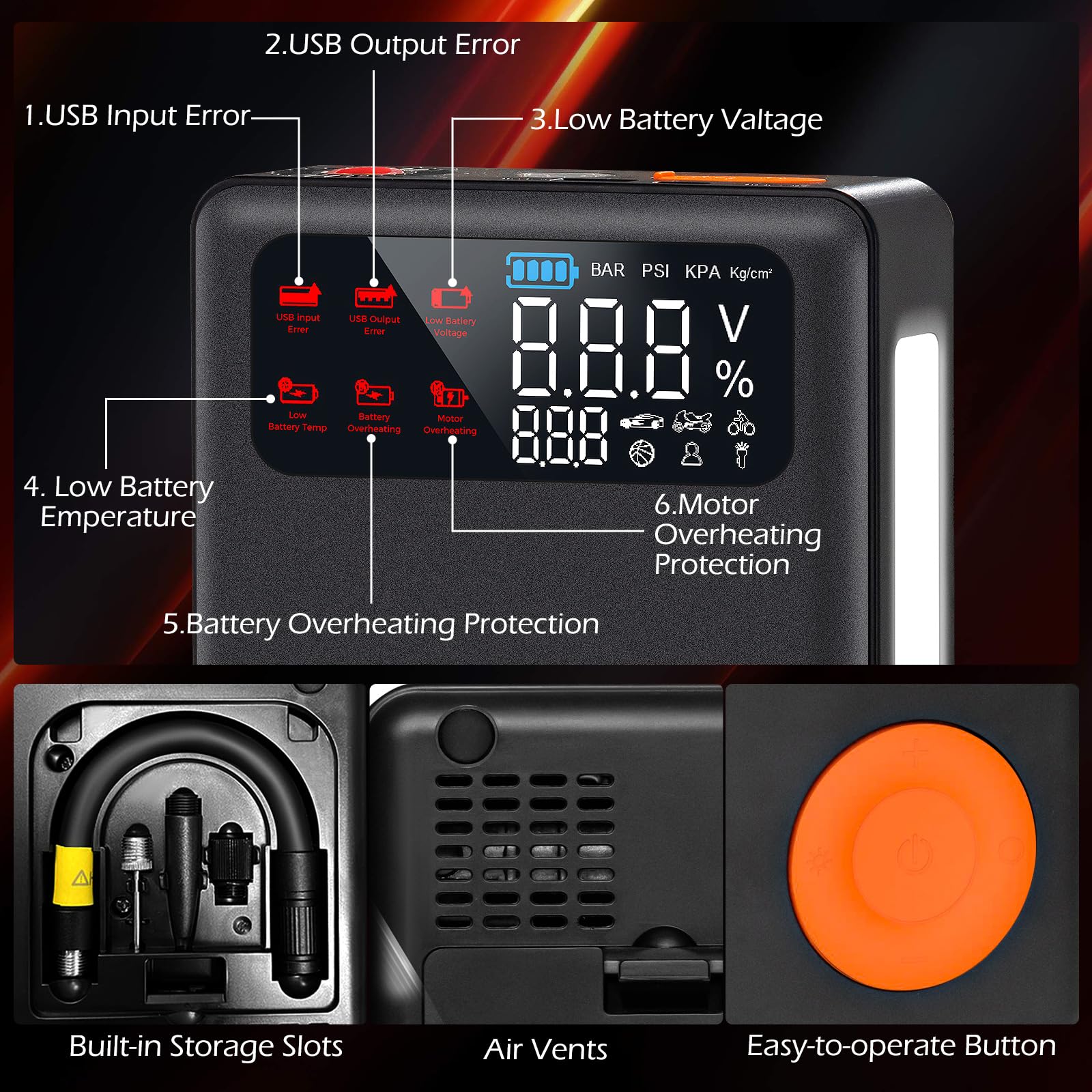 - Efficient Air Compressor Function: Featuring a 150PSI air compressor that inflates a leaky tire from 32PSI to 36PSI in just 60 seconds. Equipped with an extension air hose and 3 nozzles for various inflatables, this compressor makes tire inflation quick and easy, with LED screen for accurate pressure readings.