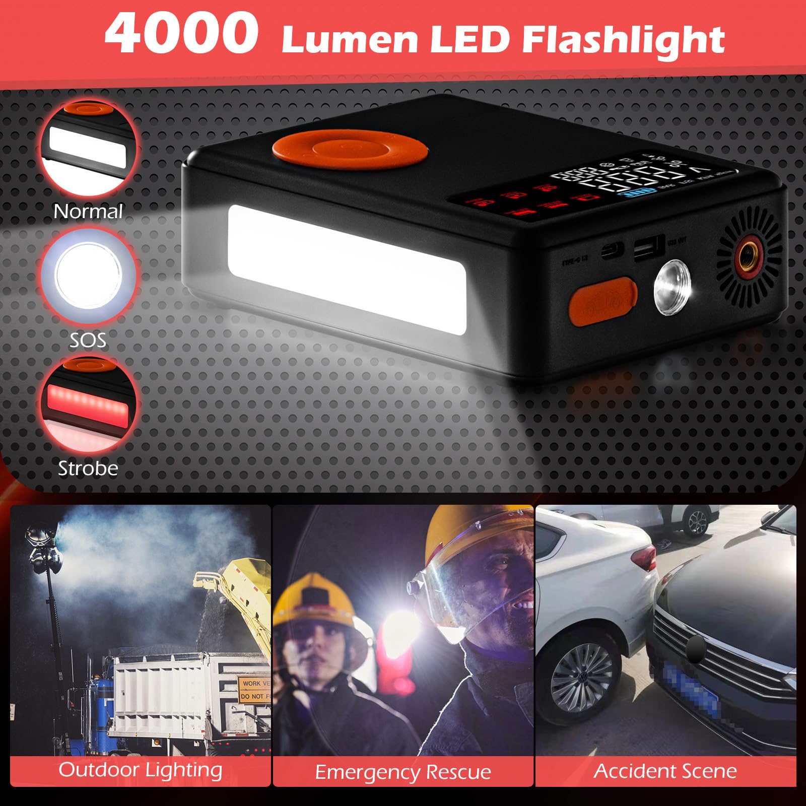 - Convenient 5-In-1 Design: This portable jump starter offers car emergency start, air compressor, lighting, SOS warning, and serves as a portable power bank. Compact in size at 5" x 2" x 6", and weighing just 3 lbs, it's ideal for road trips, camping, and emergencies, providing all the functions you need in one device.