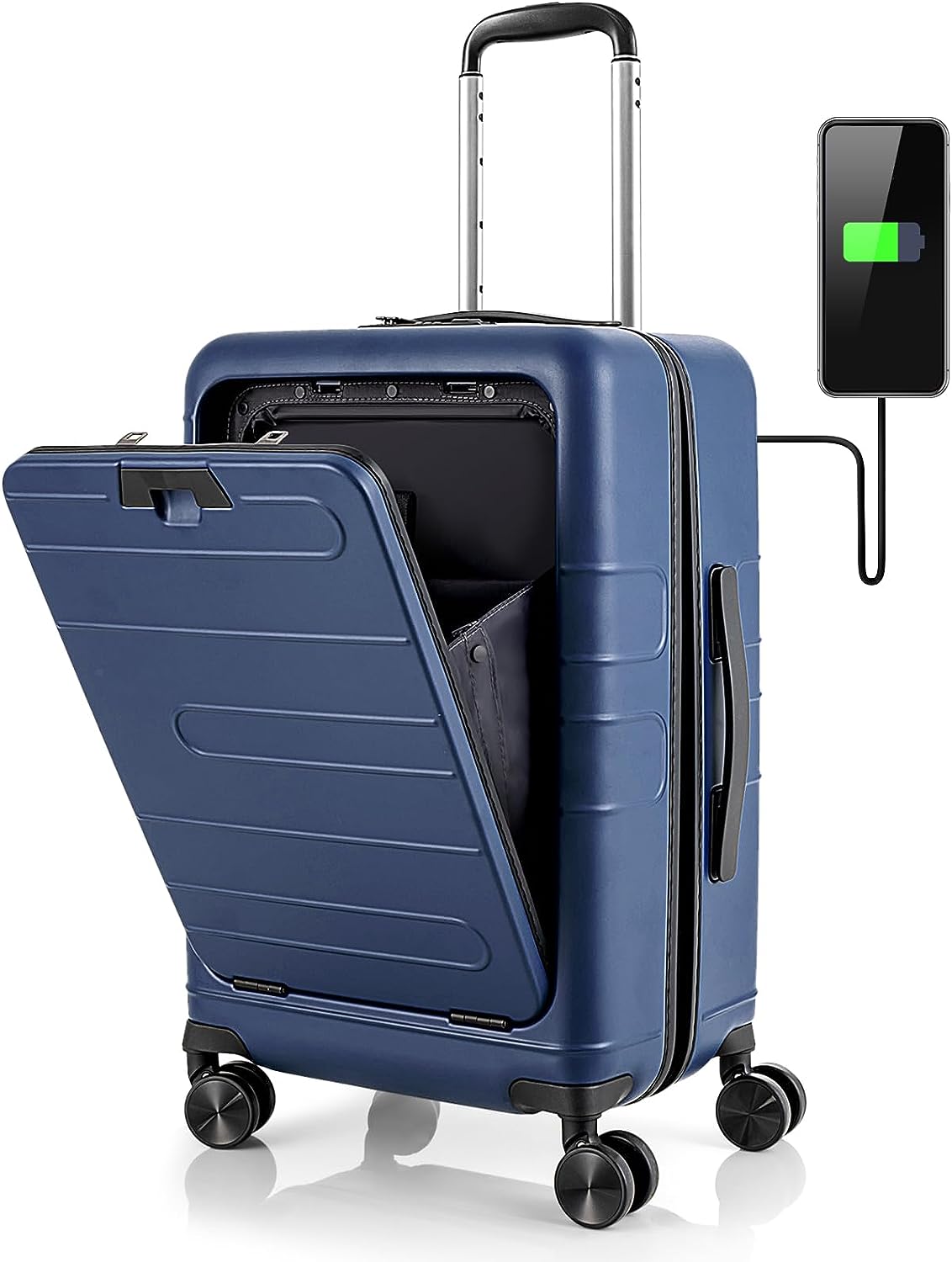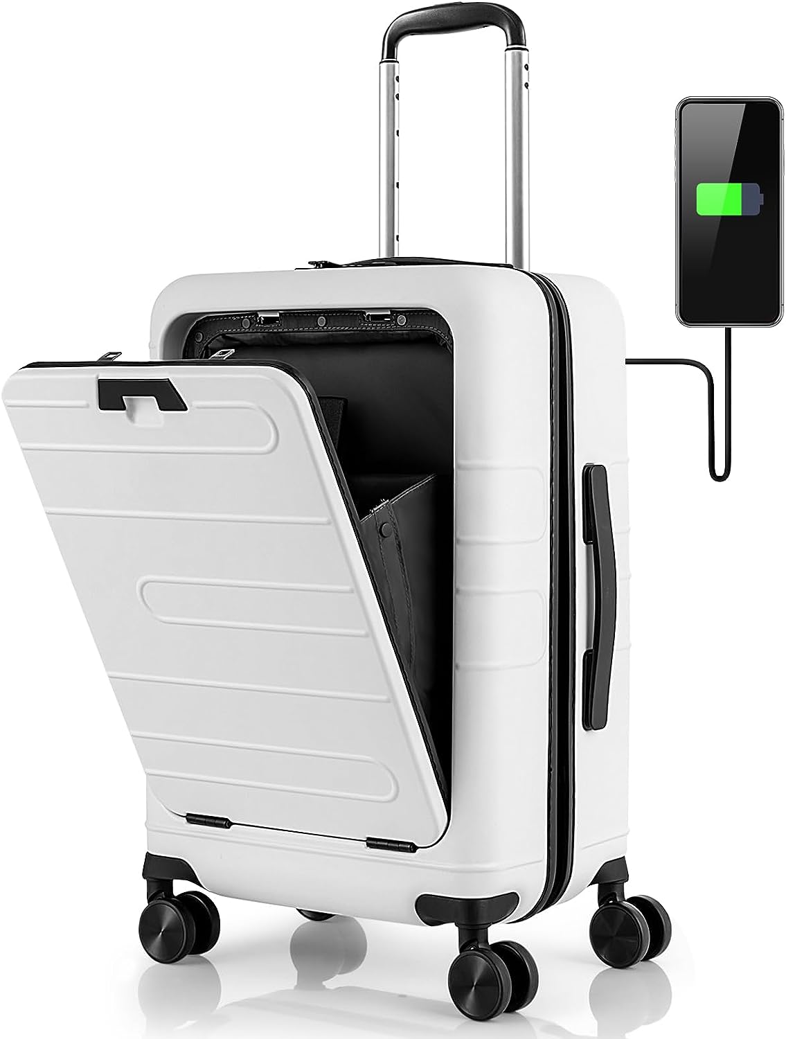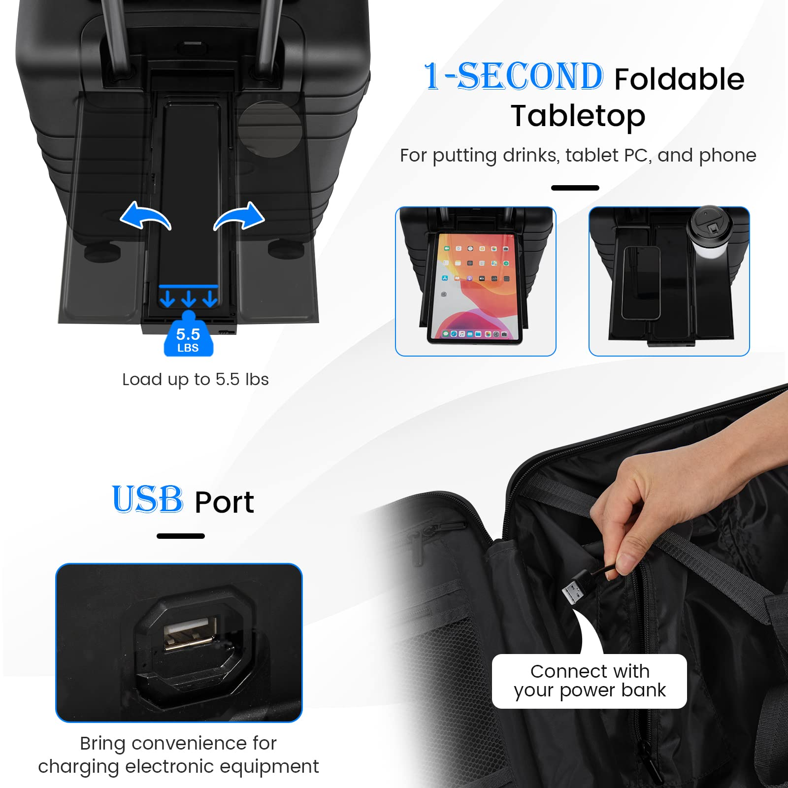 • Foldable Tabletop & USB Port: The PC hardshell suitcase comes with a foldable tabletop that can be easily opened or folded in seconds, allowing you to put drinks, a tablet PC, and a phone while waiting for the flight. More than that, it also features a built-in USB port and an interior power bank compartment that provides a quick connection to your portable electronic device for a quick charge. (power bank not included)