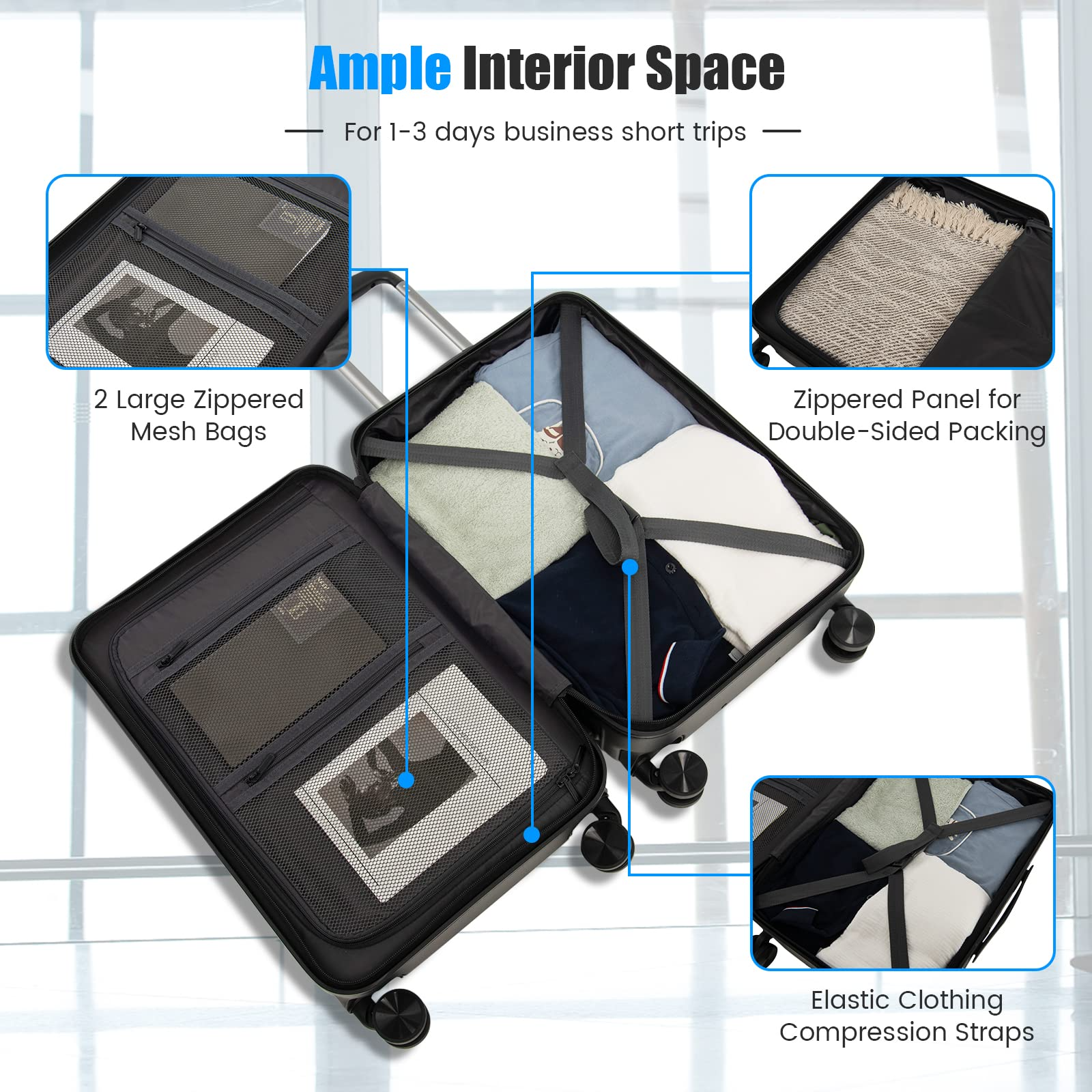 • Ample Interior Space: The interior of the 20"carry-on luggage features elastic clothing compression straps, 2 large zippered mesh bags, and a zippered panel for double-sided packing, which is suitable for 1-3 days business short trips. And thanks to the reasonable layout, there is no need to worry about your things being in a mess when you open the suitcase.
