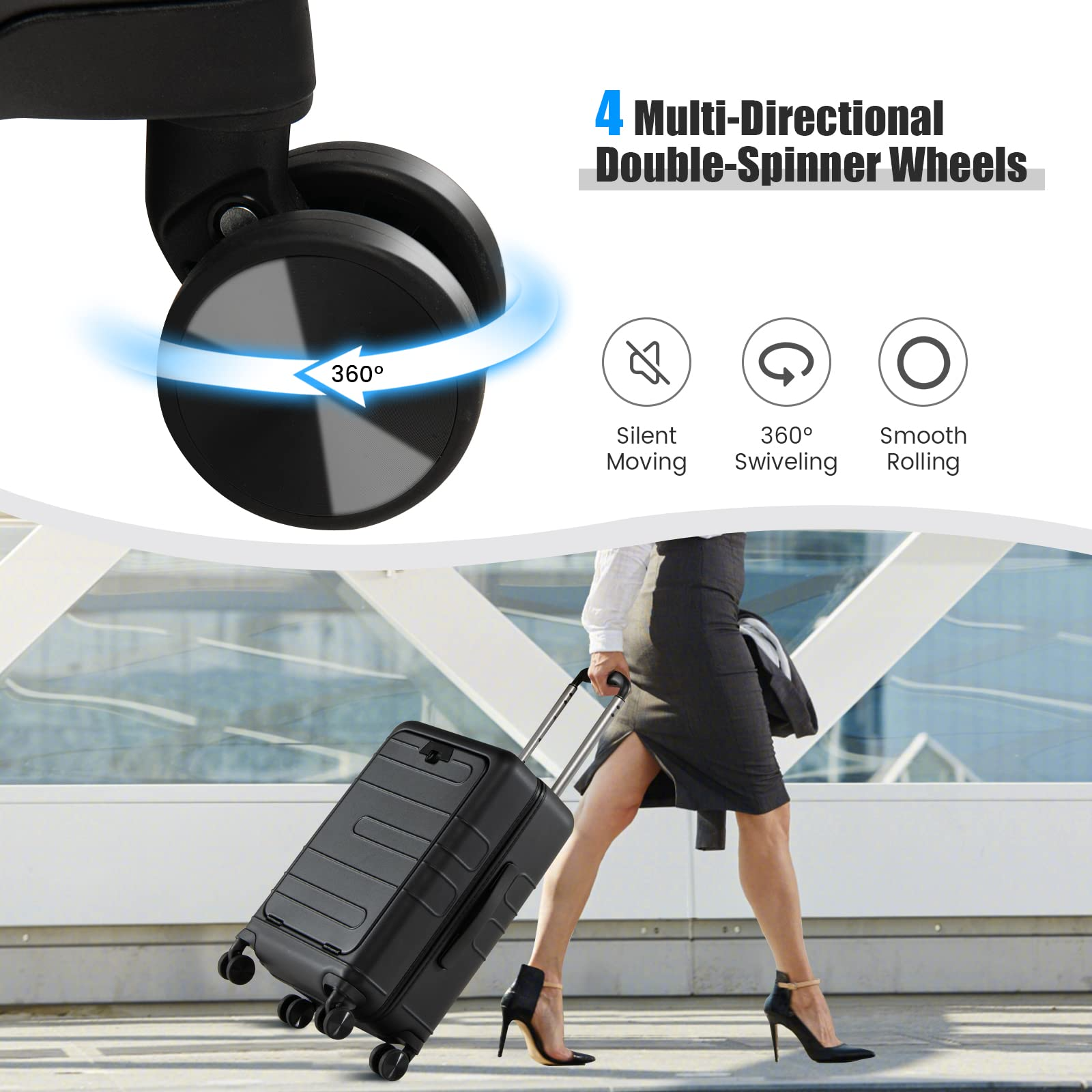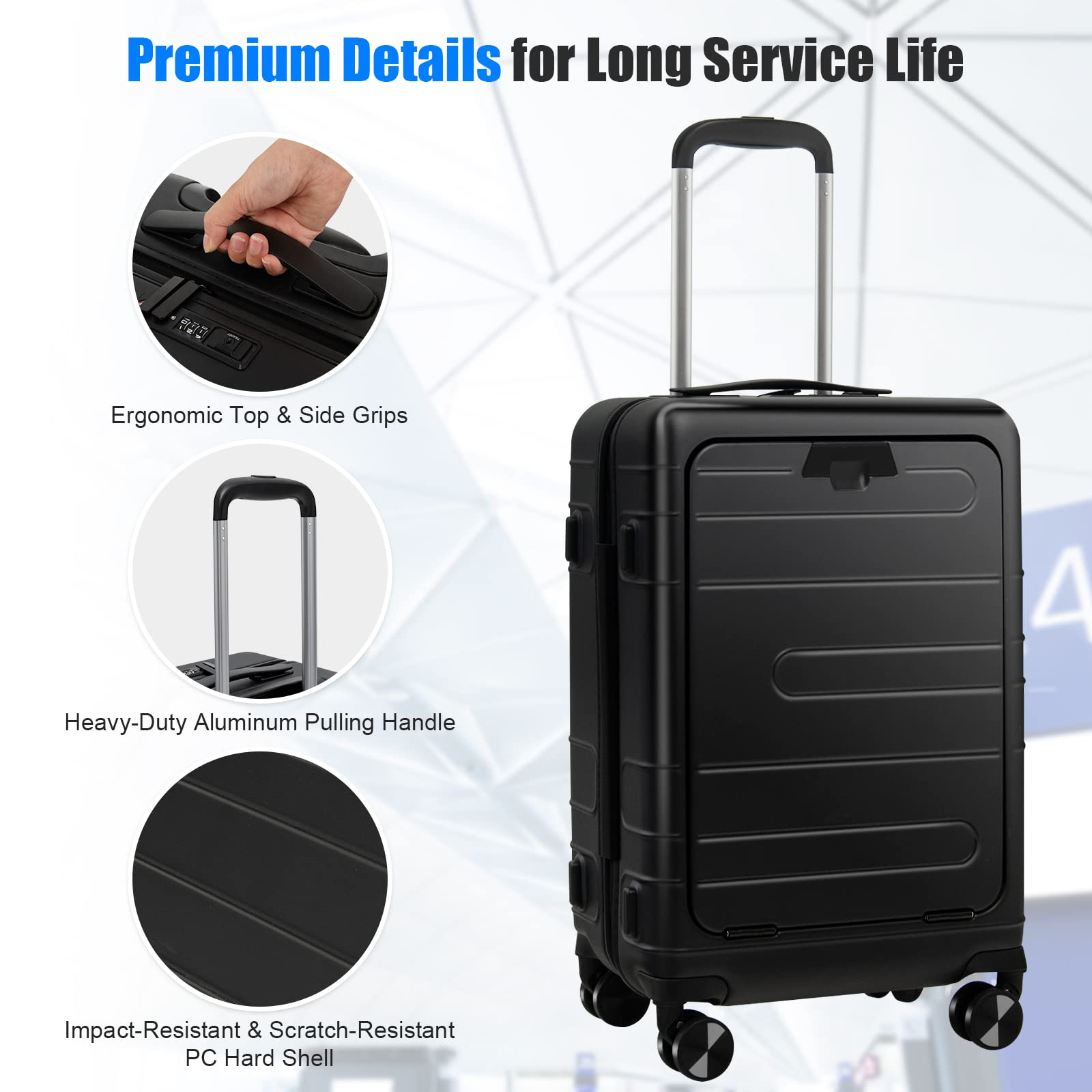Enjoy your Trip with This Practical and modern Carry-on Suitcase! Our 20"carry-on luggage measures 14"x 9"x 21.5"(L x W x H), which meets the carry-on baggage requirements of most airlines, and is enough for short trips and business travels. The hardshell suitcase comes with a front pocket with 5 compartments: a padded laptop pocket, an iPad pocket, 2 ID bags, and a mesh pocket, meeting your multiple storage needs. And we suggest storing a 15.6"laptop and a 9.7" iPad. More than that, the spinner luggage is equipped with a foldable tabletop and a USB port, making your travel more convenient. And the 3-digit combination TSA lock keeps your belongings safe and secure. Quiet spinner wheels and a height-adjustable telescoping handle allow you to maneuver the suitcase more easily, saving you effort. With an all-black appearance and clear lines, the practical hardshell suitcase can also add a sense of fashion for you.