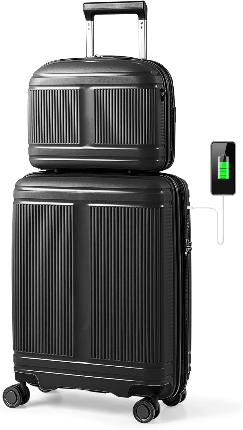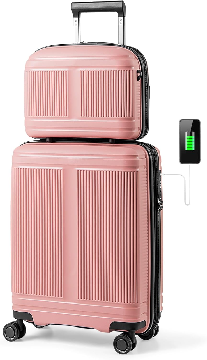 Our 2-piece luggage set includes a 14”/35 cm hardshell cosmetic case and a 20”/50 cm carry-on suitcase, which meet all international airline regulations for carry-on size, ensuring a hassle-free travel experience. And the suitcase offers 15% expandable capacity for packing more luggage on the trip. The cosmetic case can be carried by hand, hung over the shoulder, or secured on the suitcase pole. Besides, the suitcase boasts an innovative interior layout while the cosmetic case provides several compartments inside, providing ample storage space for easy organization and wet/dry separation. Enhancing convenience and security, the suitcase features a built-in USB port for on-the-go charging and a 3-digit TSA lock that is different from being damaged. More than that, it is equipped with smooth spinner wheels and a 4-level telescoping handle, allowing for smooth maneuverability and effortless navigation through airports and crowded spaces.