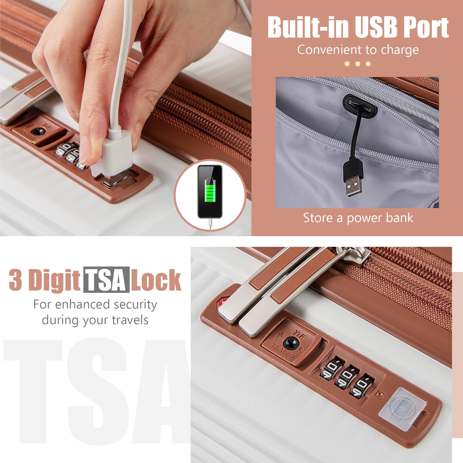- ?【USB Charging and TSA Lock】 The carry-on luggage is equipped with a built-in USB port on the side for charging your devices on the go, complete with a nifty internal pouch to store a power bank. Furthermore, it boasts a 3-digit TSA lock, ensuring your belongings are safe and sound.
