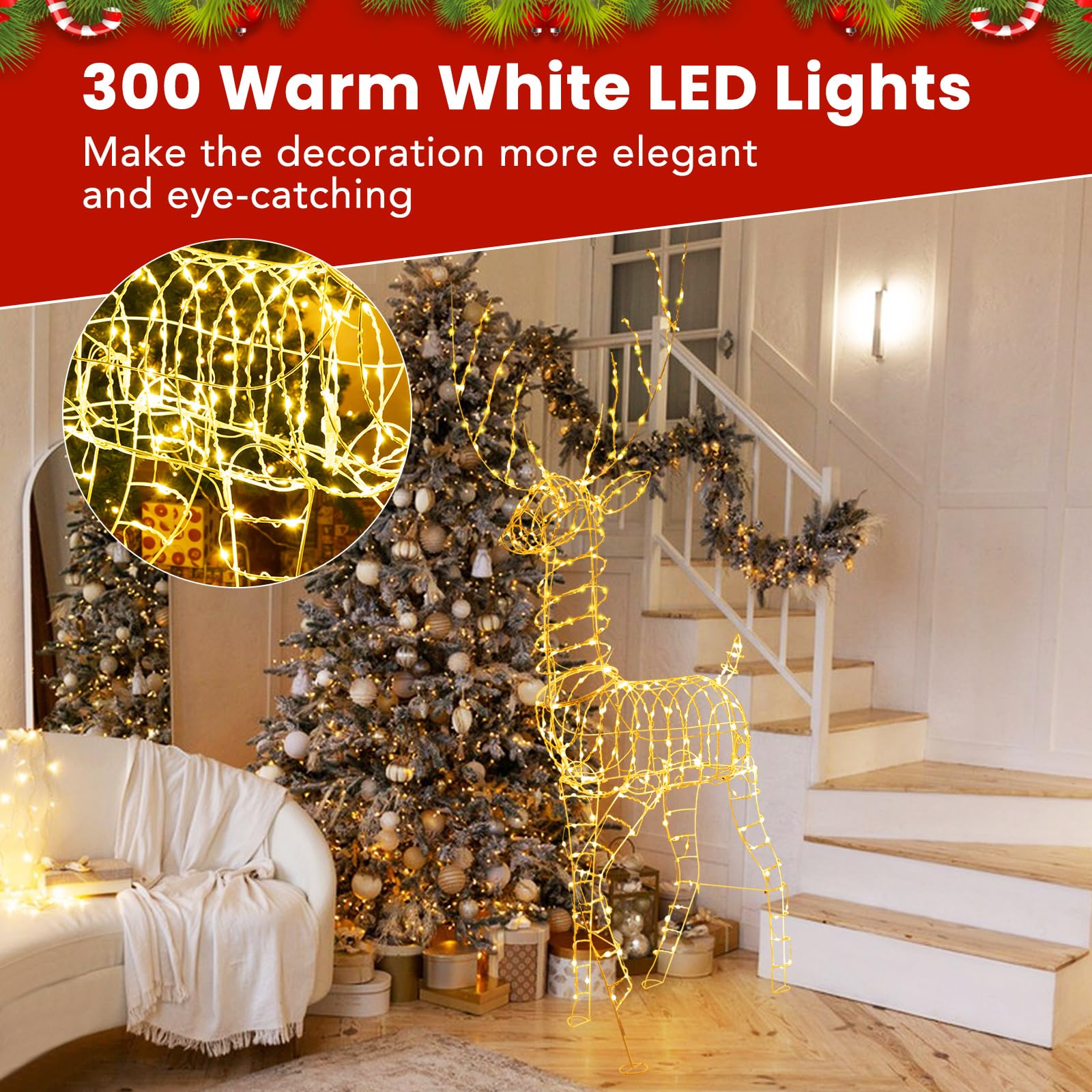 The 300 warm white LED lights make the decoration more elegant and eye-catching. Moreover, this all-weather, IP44 reindeer is crafted to withstand any weather condition, ensuring it remains a steadfast part of your holiday display. Coming with all necessary accessories and the sturdy metal base, the reindeer will stand without any wobbling. It will be the perfect festive centerpiece to cherish for years. Elevate your holiday spirit with this eye-catching reindeer decoration.